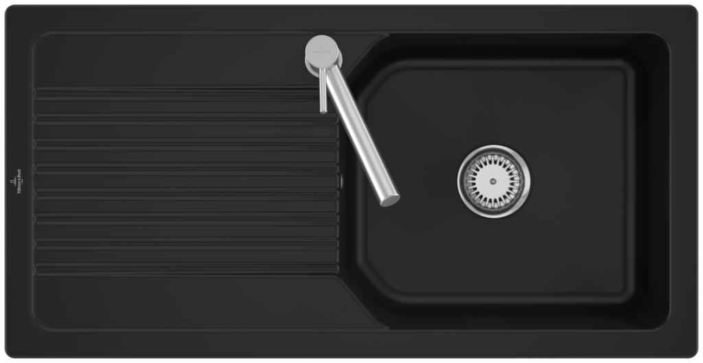 Keramický dřez pro horní montáž, bez excentru, barva Pure black, šířka 100 cmKeramický dřez Villeroy & Boch Linara je vyroben z materiálu CeramicPlus, který zajišťuje vyjímečnou tvrdost, odolnost proti poškrábání nebo jinému poškození a také odolnost proti vysokým teplotám. Povrch je odolný proti cizím látkám a nečistotám, takže se výborně čistí a potraviny na něm nezanechávají žádné stopy. Materiál CeramicPlus je vyroben ze 100% přírodních materiálů, je barevně stálý a nepřijímá chutě ani zápachy, takže ja absolutně nezávadný pro potraviny. Materiál: keramika s úpravou CeramicPlus Barva: Pure black, černá matná Dřez je určen pro horní montáž na pracovní desku Dřez je oboustranný - vanička může být napravo nebo nalevo Obsahuje odpadovou sadu bez excentru (ruční ovládání výpusti) a sítko na nečistoty Sifon není součástí dodávky (možno doobjednat pod označením 94060000) Rozměry dřezu (ŠxHxV): 1000 x 510 x 200 mm Rozměry výřezu (ŠxH): 970 x 480 mm Minimální šířka skříňky: 600 mm Hmotnost: 24 kg Při objednávce uvádějte číslo otvoru pro baterii - viz nákres Tento typ dřezu se vyrábí v barvách White alpin, Stone White, Cream, Ivory, Almond, Steam, Fossil, Stone, Graphite, Pure Black, Snow White, Timber, Chromite. Tento dřez s odpadovou sadou s excentrem je na poptávku.
