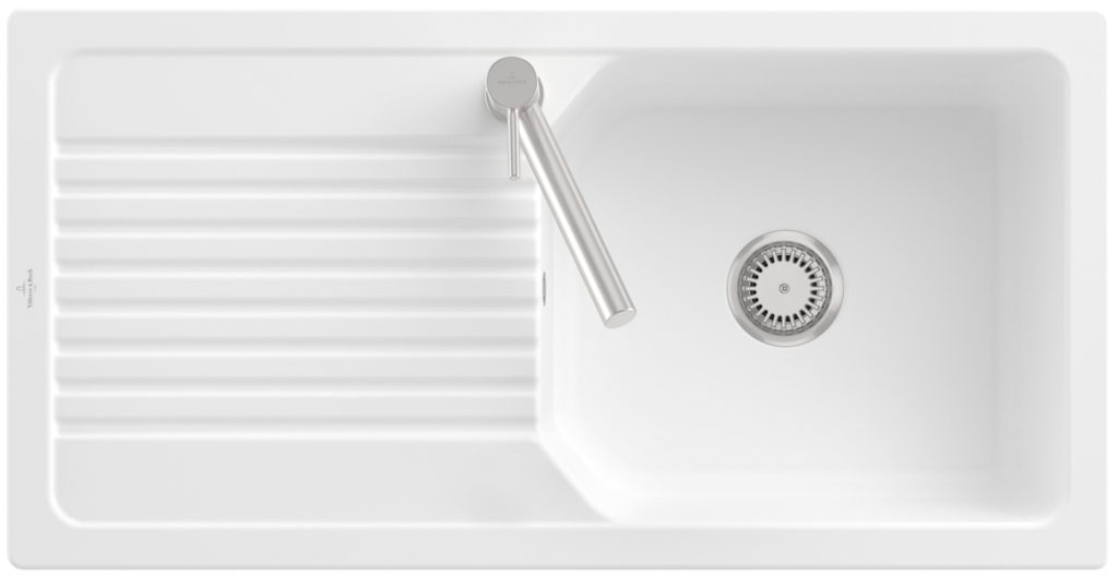 Keramický dřez pro horní montáž, bez excentru, barva Stone white, šířka 100 cmKeramický dřez Villeroy & Boch Linara je vyroben z materiálu CeramicPlus, který zajišťuje vyjímečnou tvrdost, odolnost proti poškrábání nebo jinému poškození a také odolnost proti vysokým teplotám. Povrch je odolný proti cizím látkám a nečistotám, takže se výborně čistí a potraviny na něm nezanechávají žádné stopy. Materiál CeramicPlus je vyroben ze 100% přírodních materiálů, je barevně stálý a nepřijímá chutě ani zápachy, takže ja absolutně nezávadný pro potraviny. Materiál: keramika s úpravou CeramicPlus Barva: Stone white, bílá matná Dřez je určen pro horní montáž na pracovní desku Dřez je oboustranný - vanička může být napravo nebo nalevo Obsahuje odpadovou sadu bez excentru (ruční ovládání výpusti) a sítko na nečistoty Sifon není součástí dodávky (možno doobjednat pod označením 94060000) Rozměry dřezu (ŠxHxV): 1000 x 510 x 200 mm Rozměry výřezu (ŠxH): 970 x 480 mm Minimální šířka skříňky: 600 mm Hmotnost: 24 kg Při objednávce uvádějte číslo otvoru pro baterii - viz nákres Tento typ dřezu se vyrábí v barvách White alpin, Stone White, Cream, Ivory, Almond, Steam, Fossil, Stone, Graphite, Pure Black, Snow White, Timber, Chromite. Tento dřez s odpadovou sadou s excentrem je na poptávku.