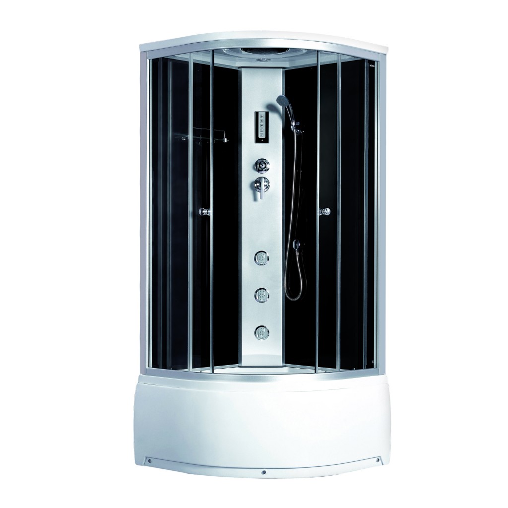Kompletní hydromasážní kabina Paulina 80 Technické údaje: Rozměry: Výška: 214 cm Šířka: 80x80 cm Hliníkové profily, saténové Dvoukřídlé posuvné dveře Sklo 4 mm, tvrzené, průhledná přední strana, černá zadní strana Rozměry sprchové vaničky: Celková výška: 43 cm Vnitřní hloubka: 29 cm Výška od země k odtokovému otvoru sprchy 14 cm Poloměr 55 cm Odtok na pravé straně sprchové vaničky Vybavení: 3 pevné hydromasážní trysky, dešťová sprcha (ve střeše), halogenové osvětlení, dotykový panel, ventilátor, skleněná polička, rádio Součástí balení není vypouštěcí a zacvakávací zátka