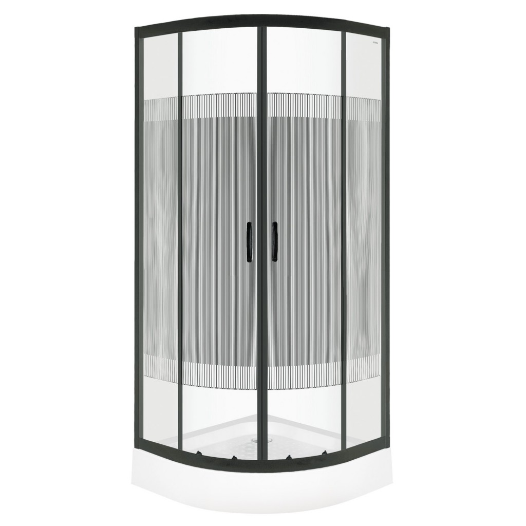 Sprchový kout se sprchovou vaničkou Rozměry: 90 x 90 x 195 cm Rozměry sprchové vaničky: 90 x 90 x 15 cm Profily: hliník, černý Dveře: dvoukřídlé, posuvné Sklo: 4 mm, tvrzené, průhledné s černým vzorem Sprchová vanička: akrylát, bílá Korek je součástí balení