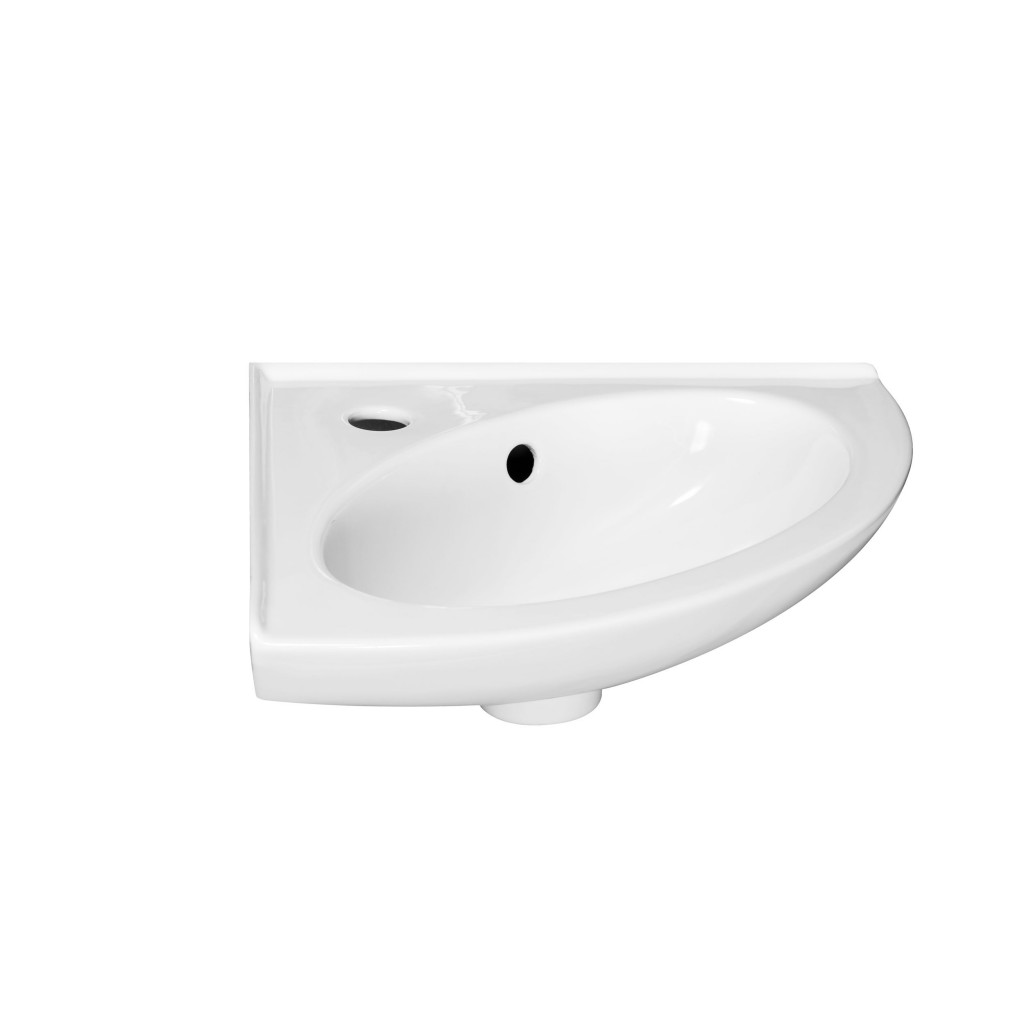 Rohové závěsné umyvadlo ELF NAR ze sanitární keramiky Technické údaje: Barva bílá Trojúhelníkový tvar Rozměry: výška 15,5 cm, šířka 42 cm, hloubka 39 cm