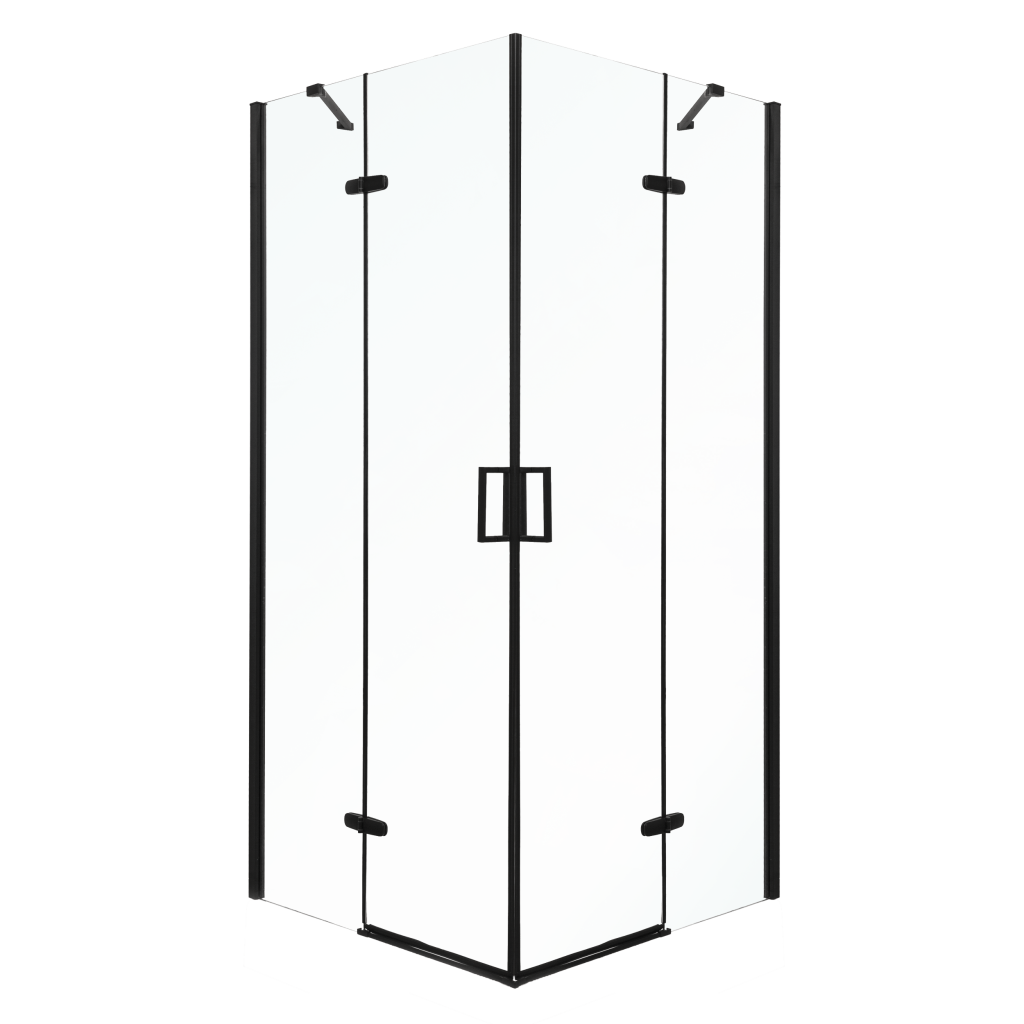 Sprchový kout Flow v černé barvě, rozměry 80 × 80 cm. Data: Rozměry - 78,5 x 78,5 x 195 cm Profily - hliník, černé Dveře - dvoukřídlé s panty Sklo - 6 mm, tvrzené, průhledné; s ochranným povlakem KERRA PROTECT Montáž – rohová Kabinu lze namontovat na vhodně připravenou podlahu a na standardní sprchovou vaničku o rozměrech 80 × 80, např. Oskar nebo Victor (k dispozici samostatně)