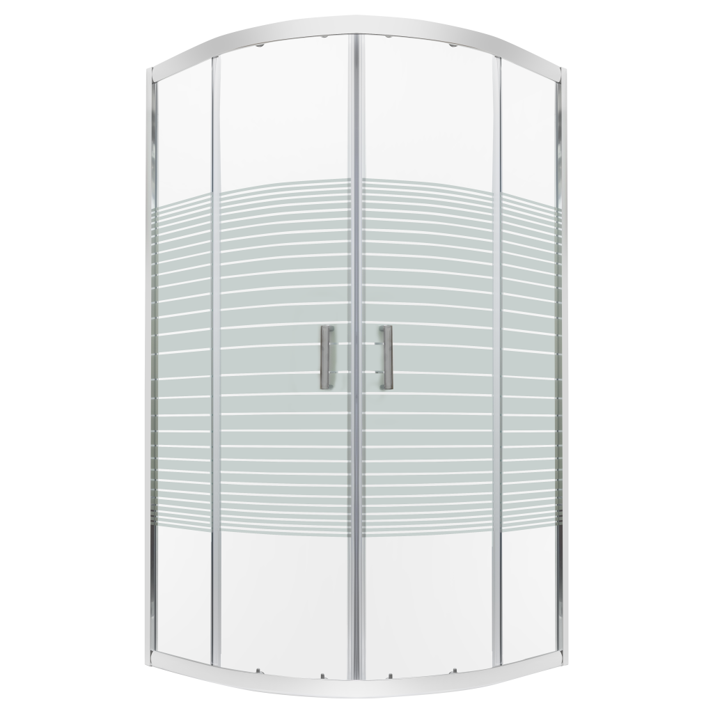 Sprchový kout Madera STR 90 bez sprchové vaničky Data: Rozměry - 88 x 88 x 190 cm Profily - hliník, chrom Dveře - dvoukřídlé, posuvné Sklo - 4 mm, tvrzené, průhledné s dekorem (bílé pruhy) Kabina je vhodná pro standardní sprchové vaničky s poloměrem R 55.
