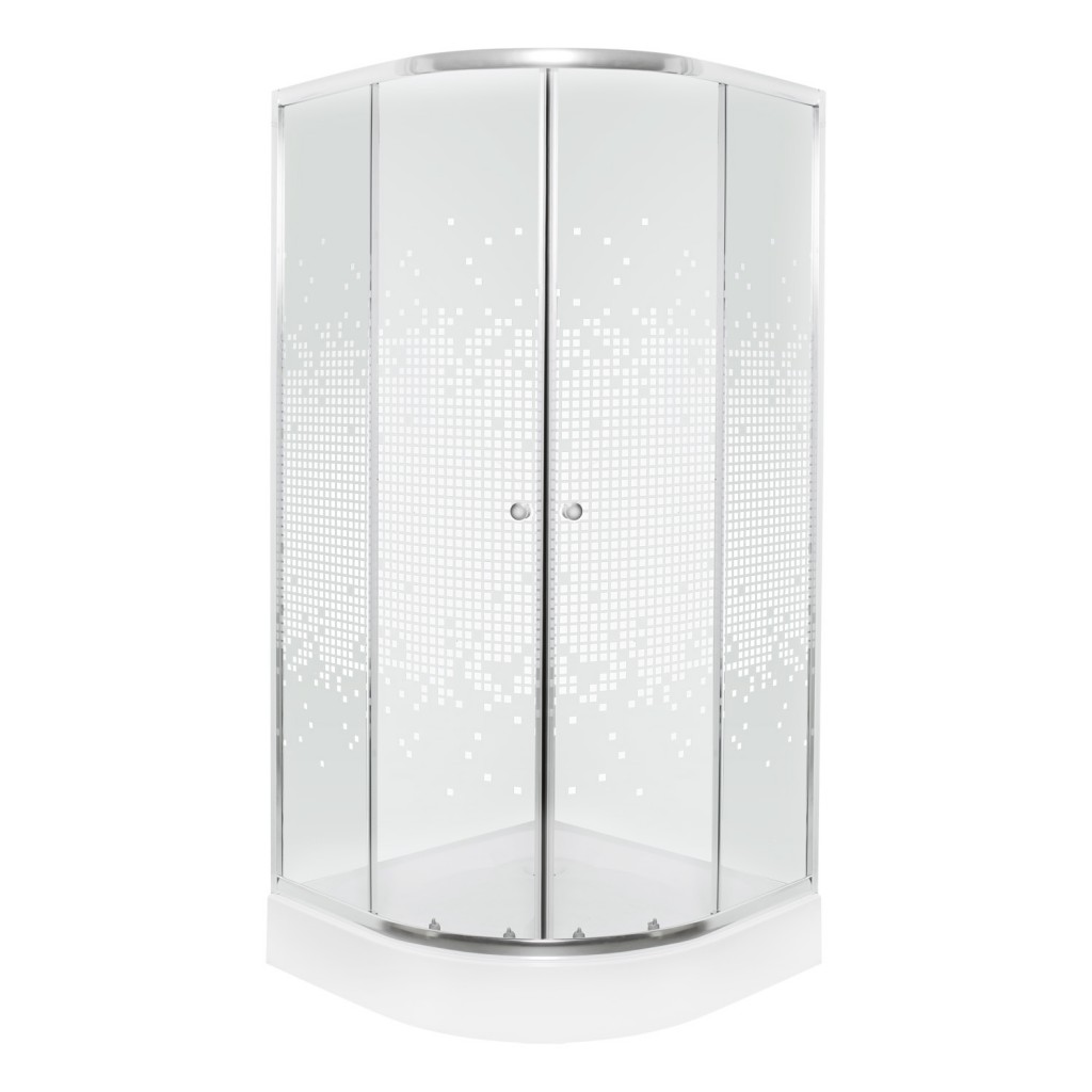 Sprchový kout s vaničkou, rozměry 80 × 80 Pixel, bílá. Data: Rozměry - 80 × 80 × 198 cm Profily - hliník, chrom Dveře - dvoukřídlé, posuvné Sklo - 4 mm, tvrzené, průhledné s dekorem (čtverečky) Rozměry sprchové vaničky - 80 × 80 × 15 cm Sprchová vanička - akrylátová v bílé barvě