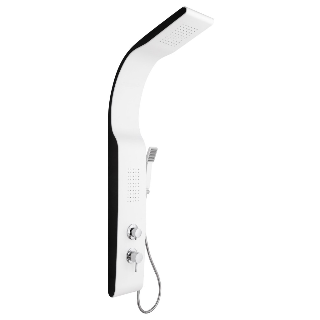 Sprchový panel z ABS Technické údaje : Barva bílá + černá Rozměry: výška 132 cm, šířka 20 cm, hloubka 13 cm Jeden typ proudu ve sprchové hlavici a dešťové sprše Pevné hydromasážní trysky Nástěnný držák Sada obsahuje panel, baterii, sprchovou hlavici, sprchovou hadici, připojovací hadice.