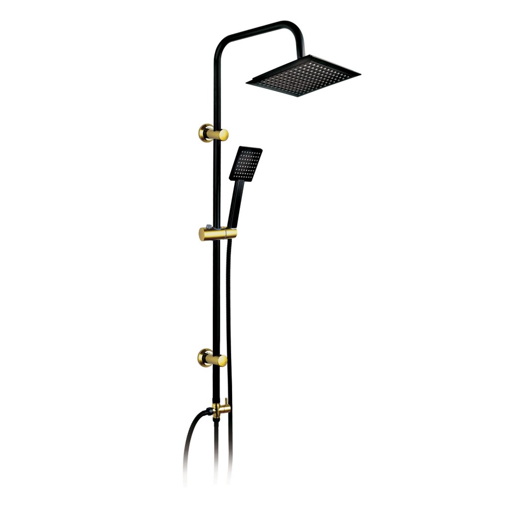 Sprchová sada Denis 63 s dešťovou sprchou je produkt, který jsme vytvořili, aby splnil očekávání našich zákazníků. Vyniká úžasným designem, který osloví nejednu osobu. Produkt jistě uspokojí i toho nejnáročnějšího uživatele. Černá v kombinaci se zlatou je nový trend v designu koupelen, který bude jistě kralovat ještě dlouho. Černá sprchová sada se zlatými doplňky , kterou nabízíme, má rozměry 110 x 20,5 x 48 cm. Sprcha má možnost nastavit rozteč montážních konzol od 30 do 80 cm. Sprchová sada Denis 63 je vybavena odolnou a proti poškození odolnou hadicí o délce 150 cm a rukojetí, která umožňuje pohodlné zavěšení sprchové hlavice. Sprchová hlavice a dešťová sprcha, které jsou součástí sady, mají jeden počet typů trysek. Sprchová sada Denis 63 má stylovou čtvercovou dešťovou sprchu ve zlaté barvě. Jeho rozměry jsou 20 x 20 cm. Celkové rozměry Výška – 110 cm Šířka - 20,5 cm Hloubka – 48 cm Sprcha: horní 20×20 cm (proti vodnímu kameni) a ruční s 1 proudem (proti vodnímu kameni) Tyč: 110 cm, ocel Hadice: 150 cm, ocelový oplet Barva: černá polomatná + zlatá Rozteč montážních konzol – 30–80 cm