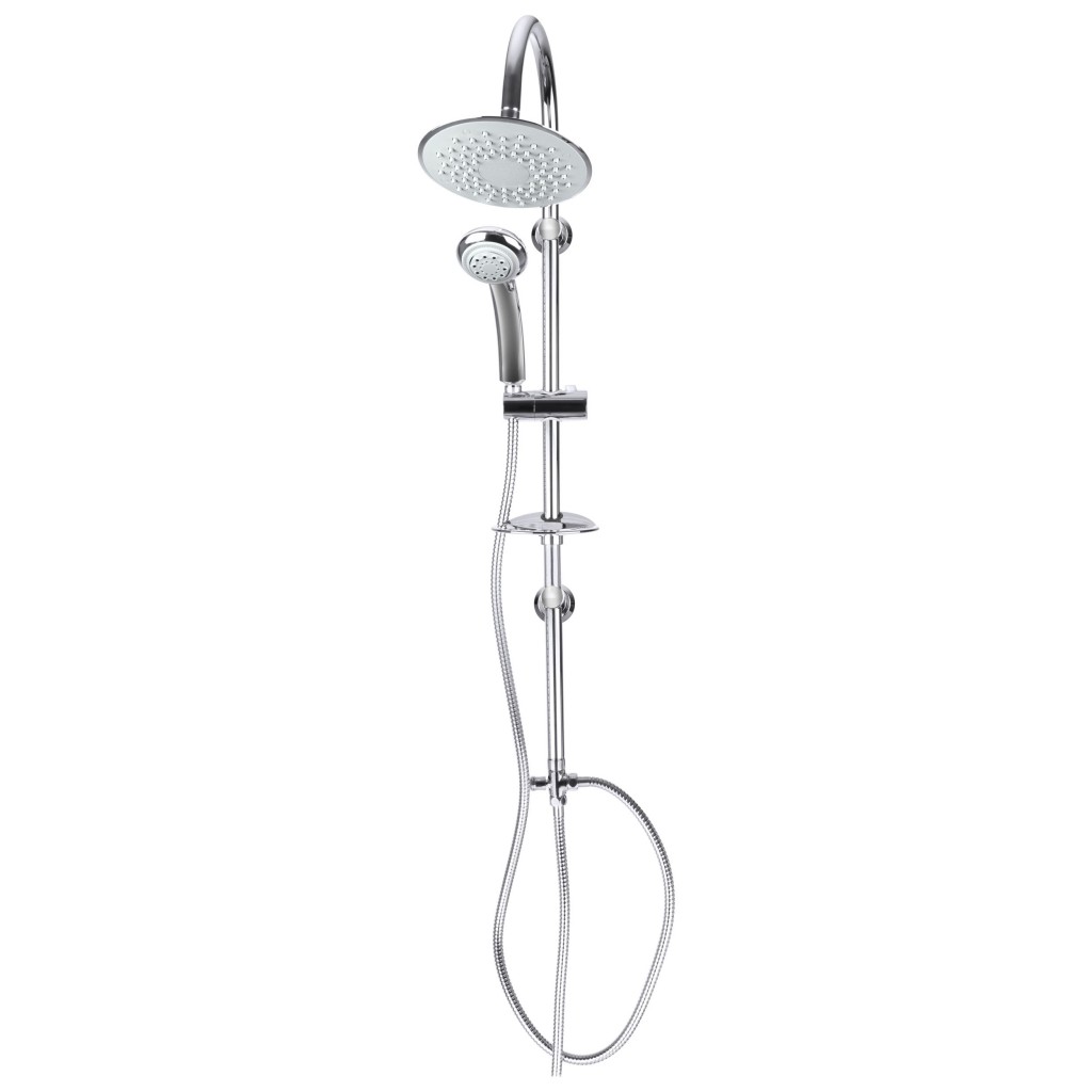 Sprchová sada Denis 10 z nerezové oceli Technické údaje: Barva chrom Rozměry: výška 100 cm, šířka 20,5 cm, hloubka 40 cm Průměr tyče 2,2 cm Typy trysek sprchové hlavice: dešťová, hydromasážní, jemná, smíšená Nástěnný držák Nastavitelná rukojeť na hrazdě Přenosná dešťová sprcha s ochranou proti vodnímu kameni, 1 typ proudu Pohyblivá miska na mýdlo Připojovací hadice jsou součástí dodávky
