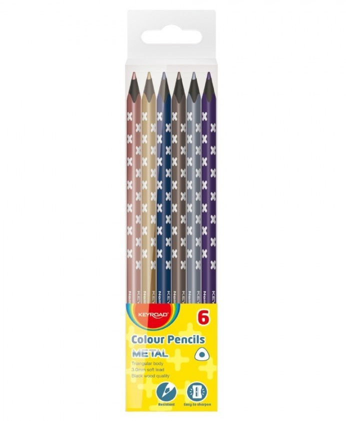 Metalické pastelky trojhranné, 6 barev. Průměr jádra 3mm. Výrazné metalické barvy zanechávají intenzivní stopu na papíře. Jsou měkké a vyrobené z kvalitního černého dřeva. Odolné vůči lámání. Snadné ořezávání. Na pastelce je volné místo pro zapsání jména.
