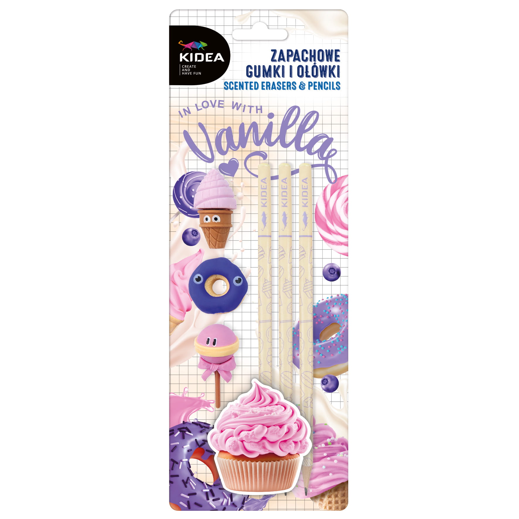 Tento rozkošný set obsahuje 3 grafitové tužky, tvrdosti HB a 3 voňavé pryže/gumy (donut, lízátko, zmrzlina) s jemnou vůní vanilky. S každým psaním nebo gumováním vás bude obklopovat příjemný, sladký závan vanilkové vůně, což z tohoto balíčku dělá nejen praktický, ale i zábavný doplněk školní tašky či kancelářského stolu. Pokud hledáte originální a praktický dárek pro své blízké, bude tato sada trefou do černého. Baleno na blistr kartě.
