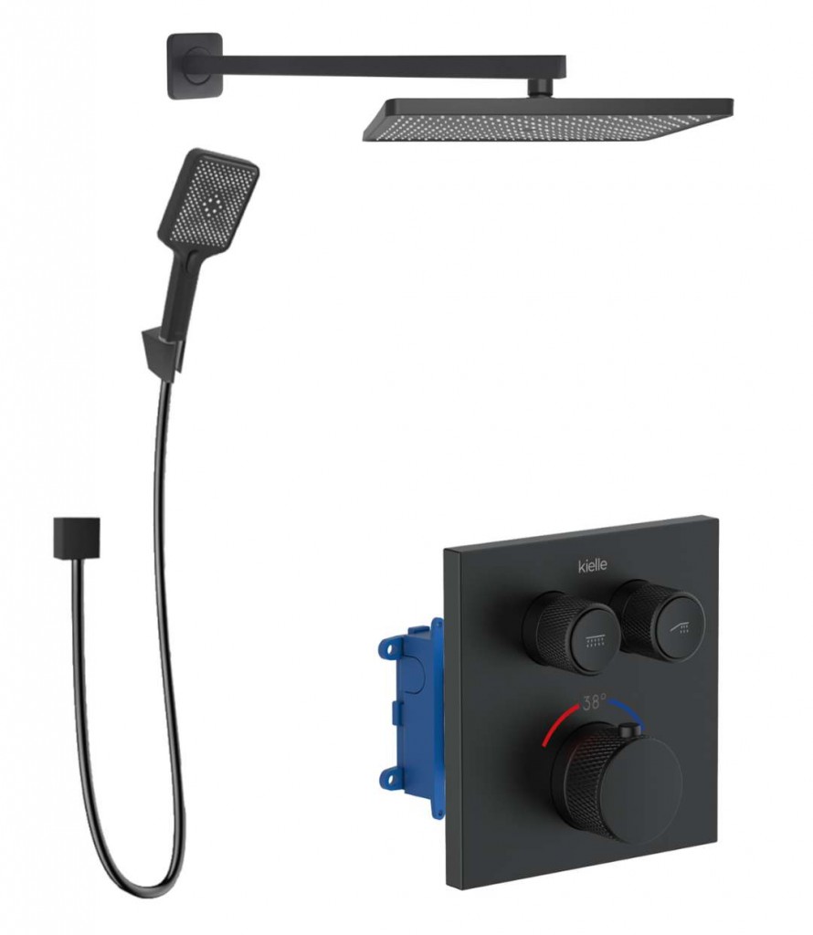 Sprchový set obsahuje Termostatickou podomítkovou baterii pro dva spotřebiče včetně tělesa ✔ moderní vzhled✔ kvalitní nerezová ocel✔ jednoduché ovládání✔ možnost regulace průtoku krycí deska z nerezové oceli barevné provedení matná černá instalace na montážní těleso, které je součástí dodávky pro 2 spotřebiče   ovládání pomocí tlačítek možnost regulace průtoku  horní sprchu 360 x 240 mm se sprchovým ramenem 430 mm rozměr sprchy 360 x 240 mm provedení matná černá 1 proud vybavena funkcí snadného čištění trysek TouchClean – vodní kámen lze z povrchu trysek jednoduše setřít sprchové rameno k instalaci na stěnu, délka 430 mm, materiál mosaz, povrchová úprava matná černá spojovací závit G 1⁄2 ruční sprchu 120 x 110 mm, 3 proudy velikost sprchové hlavice 120 x 110 mm 3 druhy proudů - MistFlow jemná mlha, intenzivní, kombinovaný  EasyClick pohodlné přepínání druhů proudu tlačítkem barevné provedení matná černá vybavena funkcí snadného čištění trysek TouchClean – vodní kámen lze z povrchu trysek jednoduše setřít sprchovou hadici 1500 mm délka 1500 mm z odolného plastu hladký povrch pro snadné čištění barva matná černá AntiTwist - systém proti překroucení, který je ukrytý v kónusu sprchové hadice nástěnný držák sprchy provedení matná černá materiál plast nástěnné kolínko provedení matná černá materiál kov připojení 1/2 G