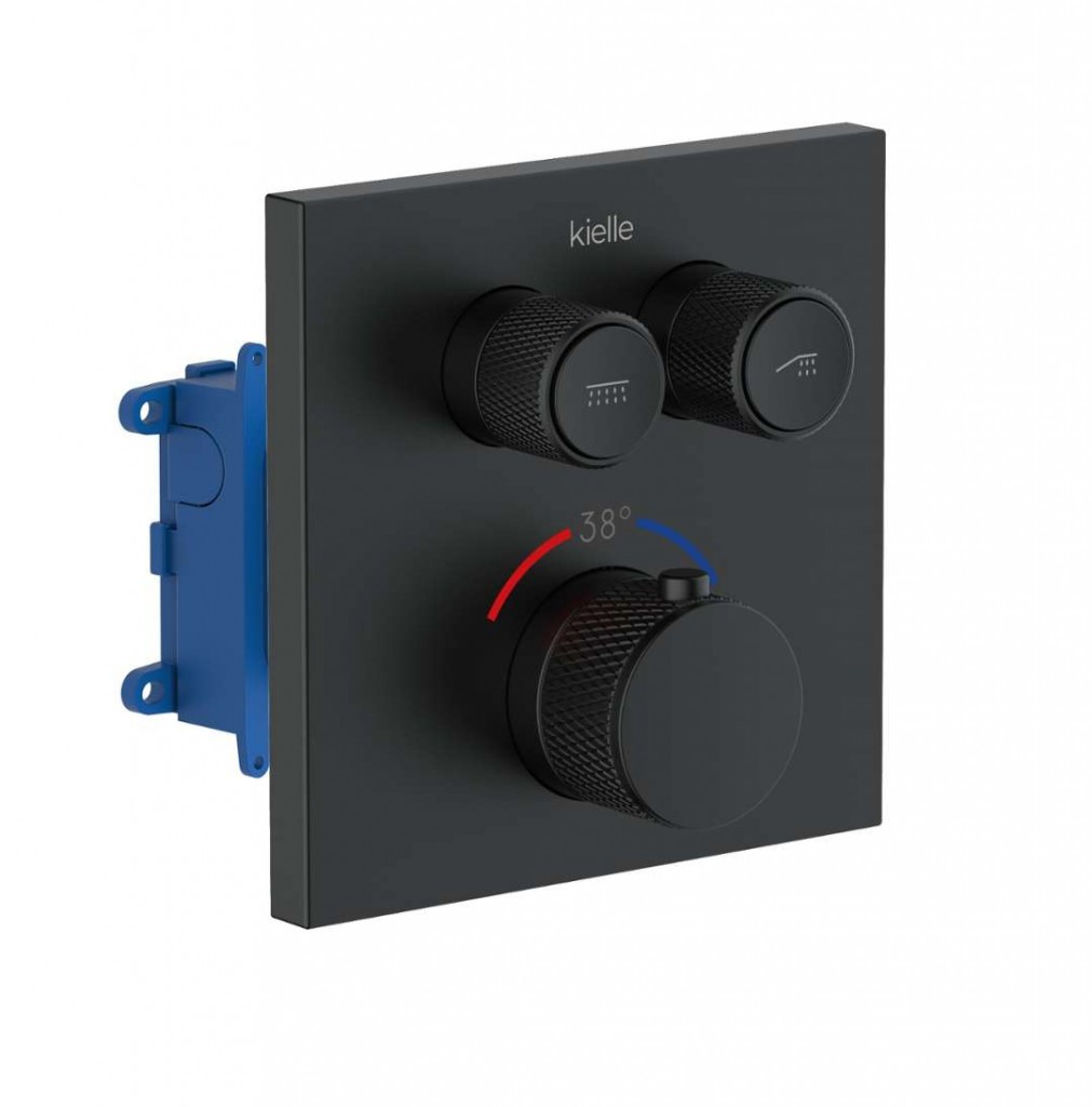 Termostatická podomítková baterie krycí deska z nerezové oceli barevné provedení matná černá instalace na montážní těleso, které je součástí dodávky pro 2 spotřebiče ovládání pomocí tlačítek možnost regulace průtoku obsahuje 3 krytky tlačítek se symboly, které lze měnit dle požadavku zákazníka
