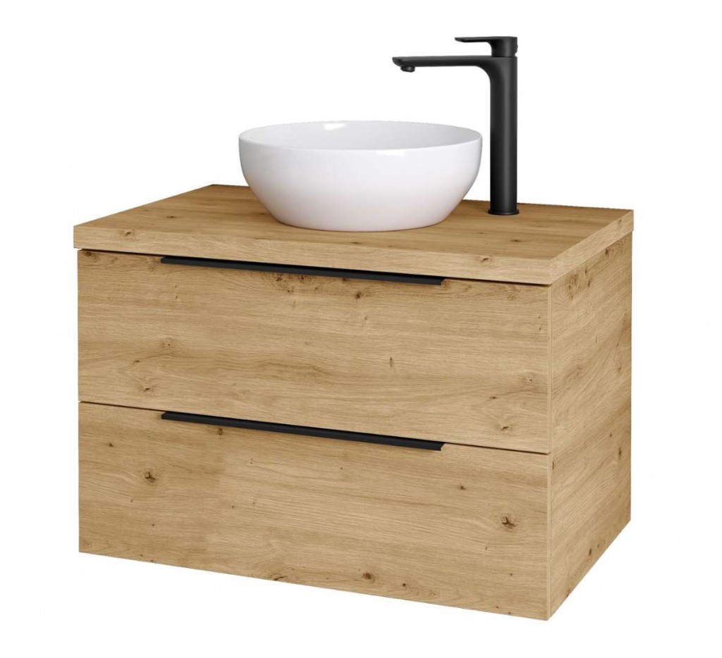 Umyvadlová skříňka včetně desky s výřezem rozměr skříňky: 800 x 536 x 500 mm materiál: LTD laminát s ABS hranou, hrany lepené PUR lepidlem přední i boční strana skříňky dekor karamel 2 zásuvky pojezdy zásuvek s pomalým dojezdem a systémem automatického dovření úchytky matné černé deska s výřezem pro umyvadlo průměr výřezu 120 mm instalace zavěšením na stěnu umyvadlo a baterie nejsou součástí balení, je třeba je objednat samostatně Dodáváno ve smontovaném stavu