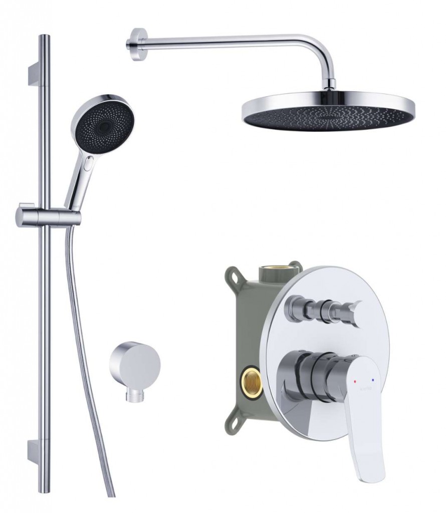 Sprchový set obsahuje pákovou podomítkovou baterii pro dva spotřebiče včetně tělesa provedení chrom instalace na montážní těleso, které je součástí dodávky s přepínačem pro 2 spotřebiče keramická kartuše ovládání pákou horní sprchu 260 mm se sprchovým ramenem 350 mm průměr sprchy 260 mm 1 proud barevné provedení chrom / černá vybavena funkcí snadného čištění trysek TouchClean – vodní kámen lze z povrchu trysek jednoduše setřít sprchové rameno k instalaci na stěnu, délka 350 mm, materiál mosaz, povrchová úprava chrom spojovací závit G 1⁄2 ruční sprchu 130 mm, 3 proudy průměr 130 mm 3 druhy proudů - jemný SilkFlow, intenzivní, kombinovaný EasyClick pohodlné přepínání druhů proudu tlačítkem barevné provedení chrom / černá vybavena funkcí snadného čištění trysek TouchClean – vodní kámen lze z povrchu trysek jednoduše setřít sprchovou tyč 700 mm průměr 19 mm materiál nerez povrchová úprava chrom s nástěnnými držáky a posuvným jezdcem sprchovou hadici 1500 mm délka 1500 mm z odolného plastu s jednotným stříbrným povrchem hladký povrch pro snadné čištění AntiTwist - systém proti překroucení, který je ukrytý v kónusu sprchové hadice nástěnné kolínko provedení chrom materiál kov připojení 1/2 G