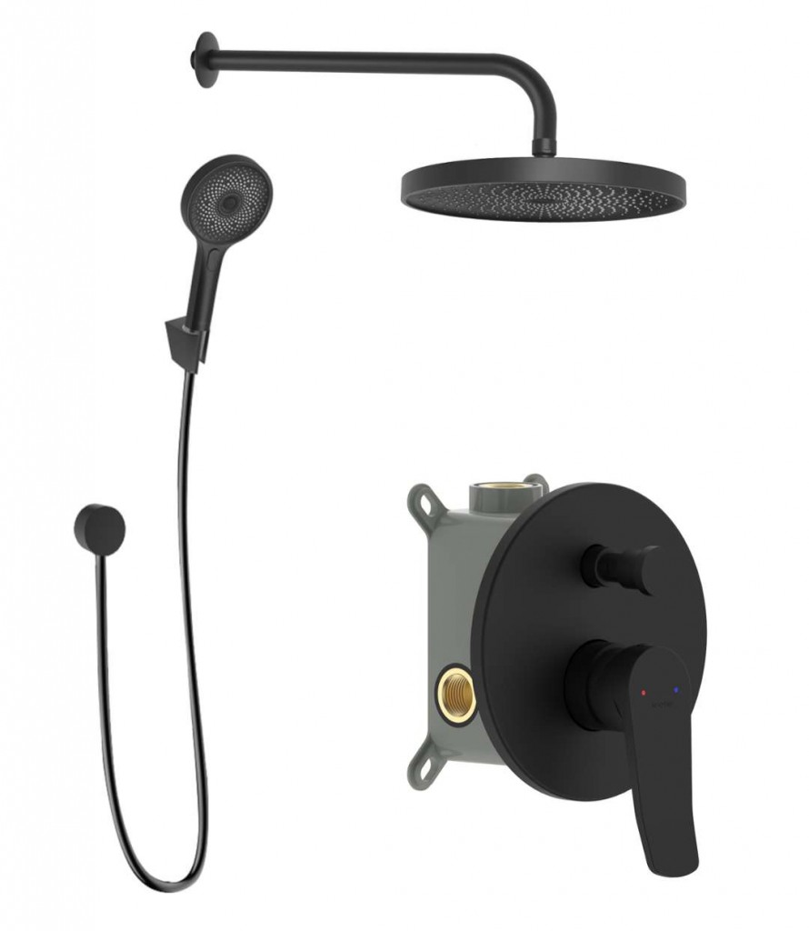 Sprchový set obsahuje pákovou podomítkovou baterii pro dva spotřebiče včetně tělesa provedení matná černá instalace na montážní těleso, které je součástí dodávky s přepínačem pro 2 spotřebiče keramická kartuše ovládání pákou horní sprchu 260 mm se sprchovým ramenem 350 mm průměr sprchy 260 mm 1 proud barevné provedení matná černá vybavena funkcí snadného čištění trysek TouchClean – vodní kámen lze z povrchu trysek jednoduše setřít sprchové rameno k instalaci na stěnu, délka 350 mm, materiál mosaz, povrchová úprava matná černá spojovací závit G 1⁄2 ruční sprchu 130 mm, 3 proudy průměr 130 mm 3 druhy proudů - jemný SilkFlow, intenzivní, kombinovaný EasyClick pohodlné přepínání druhů proudu tlačítkem barevné provedení matná černá vybavena funkcí snadného čištění trysek TouchClean – vodní kámen lze z povrchu trysek jednoduše setřít sprchovou hadici 1500 mm délka 1500 mm z odolného plastu hladký povrch pro snadné čištění barva matná černá AntiTwist - systém proti překroucení, který je ukrytý v kónusu sprchové hadice nástěnný držák sprchy provedení matná černá materiál plast nástěnné kolínko provedení matná černá materiál kov připojení 1/2 G