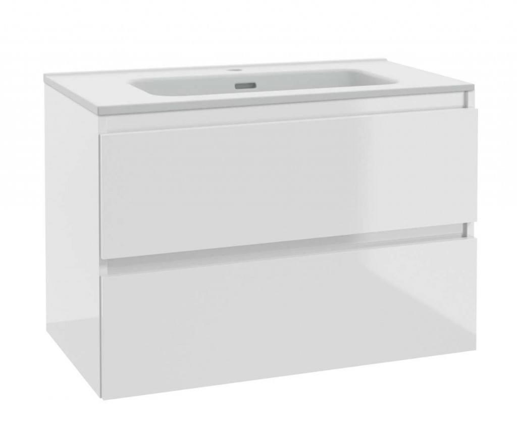 Skříňka včetně umyvadla s přepadem umyvadlo s 1 otvorem pro baterii, s přepadem barva umyvadla: bílá materiál umyvadla: sanitární keramika rozměry skříňky: šířka 800 mm, hloubka 460 mm 2 zásuvky, pojezdy zásuvek s pomalým dojezdem a systémem automatického dovření materiál skříňky - dřevotříska barva skříňky: lesklá bílá celá skříňka je lakovaná s vysokým leskem Skříňka je dodávána ve smontovaném stavu.
