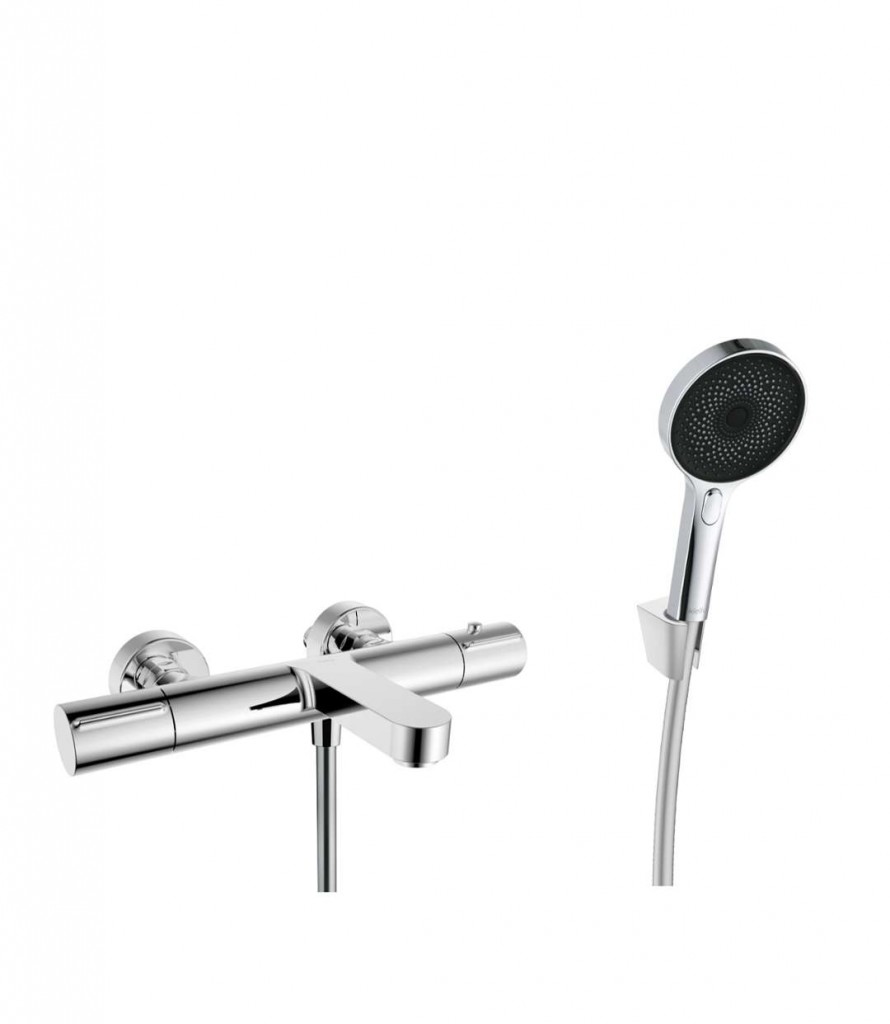 Termostatická vanová baterie barevné provedení chrom termostatická kartuše montáž na stěnu rozteč: 150 mm kulaté krycí rozety bezpečnostní zarážka při 38°C přepínání vana/sprcha sprchová souprava obsahuje ruční sprchu 130 mm, 3 proudy průměr 130 mm 3 druhy proudů - jemný SilkFlow, intenzivní, kombinovaný EasyClick pohodlné přepínání druhů proudu tlačítkem barevné provedení: chrom / černá vybavena funkcí snadného čištění trysek TouchClean – vodní kámen lze z povrchu trysek jednoduše setřít sprchovou hadici 1500 mm délka 1500 mm z odolného plastu s jednotným stříbrným povrchem hladký povrch pro snadné čištění AntiTwist - systém proti překroucení, který je ukrytý v kónusu sprchové hadice nástěnný držák sprchy materiál: plast provedení: chrom