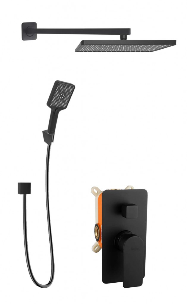 Sprchový set obsahuje pákovou podomítkovou baterii pro dva spotřebiče včetně tělesa ovládání pákou barevné provedení matná černá instalace na montážní těleso, které je součástí dodávky s přepínačem pro 2 spotřebiče keramická kartuše 35 mm horní sprchu 360 x 240 mm se sprchovým ramenem 430 mm rozměr sprchy 360 x 240 mm provedení matná černá 1 proud vybavena funkcí snadného čištění trysek TouchClean – vodní kámen lze z povrchu trysek jednoduše setřít sprchové rameno k instalaci na stěnu, délka 430 mm, materiál mosaz, povrchová úprava matná černá spojovací závit G 1⁄2 ruční sprchu 120 x 110 mm, 3 proudy velikost sprchové hlavice 120 x 110 mm 3 druhy proudů - MistFlow jemná mlha, intenzivní, kombinovaný EasyClick pohodlné přepínání druhů proudu tlačítkem barevné provedení matná černá vybavena funkcí snadného čištění trysek TouchClean – vodní kámen lze z povrchu trysek jednoduše setřít sprchovou hadici 1500 mm délka 1500 mm z odolného plastu hladký povrch pro snadné čištění barva matná černá AntiTwist - systém proti překroucení, který je ukrytý v kónusu sprchové hadice nástěnný držák sprchy materiál: plast provedení matná černá nástěnné kolínko provedení matná černá materiál kov připojení 1/2 G