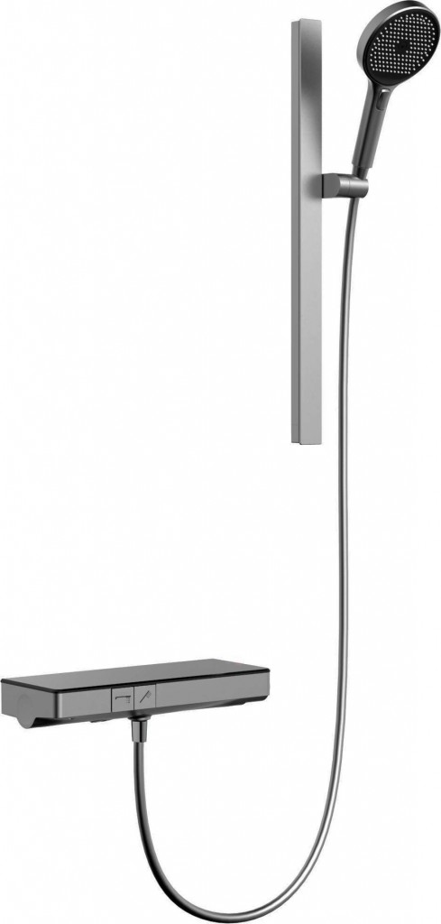 Sprchový set s termostatem barevné provedení gun metal Sprchový set obsahuje nástěnnou termostatickou baterii montáž na stěnu rozteč: 150 mm praktické ovládání pomocí tlačítek přepínání mezi ruční sprchou a praktickým vývodem pro napouštění kbelíku odkládací plocha z bezpečnostního skla bezpečnostní zarážka pri 38°C sprchovou hlavici průměr 130 mm 3 druhy proudů - jemný SilkFlow, intenzivní, kombinovaný EasyClick pohodlné přepínaní druhů proudu tlačítkem vybavená funkcí snadného čištění trysek TouchClean - vodní kámen lze z povrchu trysek jednoduše setřít sprchová tyč rozměr 600 mm posuvný držák sprchová hadice délka 1500 mm hladký povrch pro snadné čištění AntiTwist systém proti překroucení, který je ukrytý v kónusu sprchové hadice