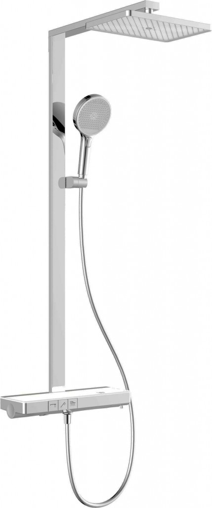 Sprchový set s termostatem barevné provedení chrom/bílá Sprchový set obsahuje nástěnnou termostatickou baterii montáž na stěnu rozteč: 150 mm praktické ovládání pomocí tlačítek přepínání mezi hlavovou, ruční sprchou a praktickým vývodem pro napouštění kbelíku odkládací plocha z bezpečnostního skla barevné provedení chrom / bílé sklo bezpečností zarážka při 38°C hlavovou sprchu rozměr 360 x 240 mm 1 proud sprchovou hlavici průměr 130 mm 3 druhy proudů - jemný SilkFlow, intenzivní, kombinovaný EasyClick pohodlné přepínaní druhů proudu tlačítkem vybavená funkcí snadného čištění trysek TouchClean - vodní kámen lze z povrchu trysek jednoduše setřít sprchovou tyč s posuvným držákem sprchy sprchová hadice délka 1500 mm z odolného plastu s jednotným stříbrným povrchem hladký povrch pro snadné čištění AntiTwist systém proti překroucení, který je ukrytý v kónusu sprchové hadice