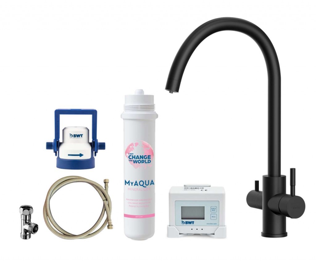 Rozsah dodávky Páková kuchyňská baterie s filtrační funkcí provedení matná černá ovládací páka vpravo pro směšování studené a teplé vody otočná páka vlevo pro filtrovanou vodu oddělené vedení a vypouštění filtrované a nefiltrované vody montáž: jednootvorová, stojánková otočné rameno, rozsah otáčení 360° keramická kartuše pružné připojovací hadice o délce 550 mm hadice pro připojení filtrace 800 mm matice 3/8 pro snadnou a bezpečnou montáž Filtr BWT MyAQUA Mineralizer filtr snižuje obsah přítomného chlóru ve vodě a to má přímý pozitivní vliv na chuť upravené vody filtr redukuje množství potenciálně přítomných těžkých kovů, např. niklu, olova nebo mědi kompatibilní s připojovací hlavicí MyAQUA a AQA drinkf filtrační kapacita: 800 l @ 14 °dGH VÍCESTUPŇOVÝ PROCES FILTRACE filtrace hrubých částic - zachytí nečistoty, např. písek nebo rez iontová výměna - uvolňuje do filtrátu cenné minerály hořčíku (magnesium) a redukuje těžké kovy, např. olovo, měď nebo nikl filtrace aktivním uhlím - redukuje organické substance, chlór a jinépříměsi mající negativní vliv na senzorické vlastnosti vody (zápach, zákal, chuť) Digitální průtokoměr Filtrační hlavice Připojovací hadice DN8, 150 cm T-kus