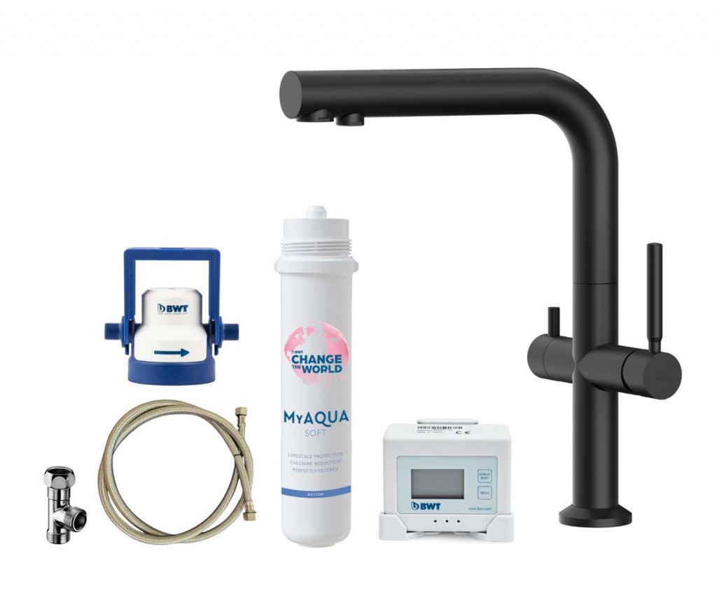 Rozsah dodávky Páková kuchyňská baterie s filtrační funkcí provedení matná černá ovládací páka vpravo pro směšování studené a teplé vody otočná páka vlevo pro filtrovanou vodu oddělené vedení a vypouštění filtrované a nefiltrované vody montáž: jednootvorová, stojánková otočné rameno, rozsah otáčení 360° kartuše 25 mm pružné připojovací hadice o délce 550 mm hadice pro připojení filtrace 800 mm matice 3/8 pro snadnou a bezpečnou montáž Filtr BWT MyAQUA Soft filtr ideálně optimalizuje vodu pro spotřebiče, které generují horkou vodu či páru, např. kávovary. filtr minimalizuje usazování vápníku a následné vytváření vodního kamene ve spotřebičích, prodlouží tak jejich životnost filtr snižuje obsah přítomného chlóru ve vodě a to má přímý pozitivní vliv na chuť upravené vody filtr odstraňuje organické příměsi a těžké kovy kompatibilní s připojovací hlavicí BWT MyAQUA a AQA drink filtrační kapacita: 800 l @ 14 °dGH VÍCESTUPŇOVÝ PROCES FILTRACE filtrace hrubých částic - zachytí nečistoty, např. písek nebo rez iontová výměna – snižuje uhličitanovou tvrdost pitné vody a chrání tak spotřebiče a kohoutkovou armaturu před usazováním vodního kamene. Redukuje těžké kovy jako měď, olovo a nikl. filtrace aktivním uhlím - redukuje organické substance, chlór a jiné příměsi mající negativní vliv na senzorické vlastnosti vody (zápach, zákal, chuť) Digitální průtokoměr Filtrační hlavice Připojovací hadice DN8, 150 cm T-kus