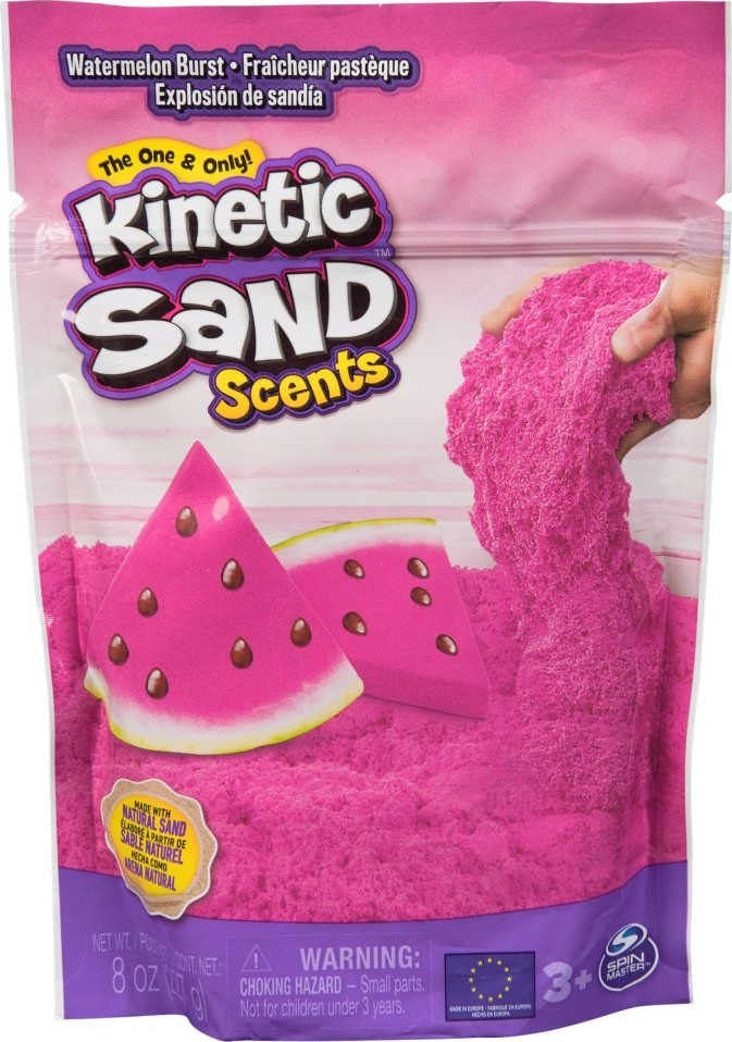 Objevte další druhy kinetického písku s rozkošnou vůní! Tento 28g sáček neónově růžového kinetického písku Watermelon Burst voní přesně jako meloun a podněcuje dětskou představivost, když si vaše ratolesti tvarují své vlastní vonící ovocné výtvory. Smíchejte písek Watermelon Burst s dalšími vonnými kinetickými písky, jako je Perfect Peach, Glorious Grape a Razzle Berry (každý se prodává zvlášť) a vytvořte zcela nové kombinace vůní a barev! Mačkejte, krájejte, tvarujte – možností, jak si s pískem hrát, je nekonečně mnoho! Tento jedinečný kinetický písek je vyroben z přírodního písku, který se lepí k sobě pro snadný úklid. Uzavíratelný sáček usnadní úklid, když je čas písek opět zabalit. Tvořte stále dokola a nechte ho protékat vašima rukama – je to tak uspokojující, že ho nebudete moci odložit! Kinetický písek je skvělou alternativou k modelíně a je vítaným doplňkem k tvořivé dílně, senzorickým hrám, dětským aktivitám a Montessori hračkám. Kinetický písek podporuje jemnou motoriku a kreativitu u dětí od 3 let prostřednictvím nezávislé hmatové hry. Přineste si domů dokonalý smyslový zážitek s vonným kinetickým pískem!