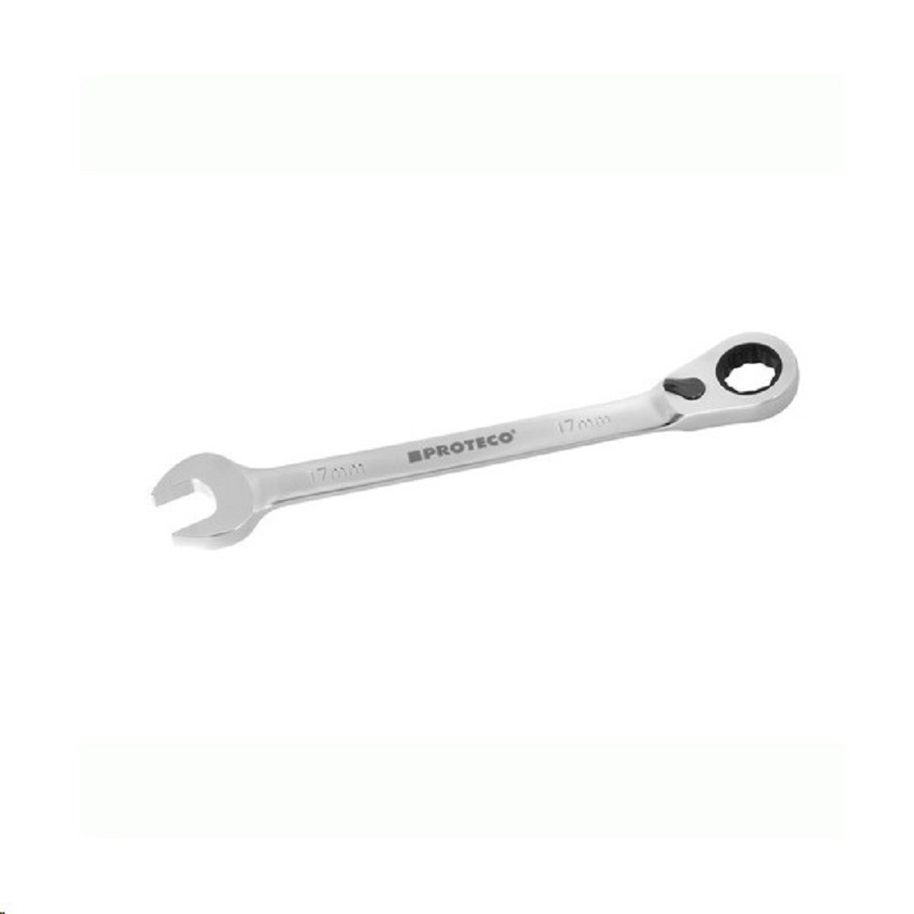 Klíč ráčnový očkoplochý 10mm s možností dorazu CrV Proteco 42.18-342-010 Ráčnový klíč s dorazem 10mm je z kvalitní chrom-vanadiové oceli. Svým použitím je vhodný pro autoprůmysl a dílenství, zejména v místech, kde nelze využít výhody standardní ráčny. Díky tenkostěnné hlavě ráčnového klíče lze pracovat v těžko přístupných místech. Ráčnový klíč s dorazem je potažen speciálním povlakem zvyšující ochranu proti korozi a případnému opotřebení. Systém dorazu umožňuje pouhým pootočením hlavy klíče zajistit šroub v ráčně a pohodlně pokračovat v práci. Změna mezi povolováním a utahováním se provádí pomocí přepínací páčky. Ráčnu klíče tvoří 72 kalených zubů, které umožňují krok záběru již po 5-ti obloukových stupních. Hlava ráčnového klíče je tenkostěnná a umožňuje tak práci v těžko přístupných místech. Utahovací moment vyhovuje normě ANSI.