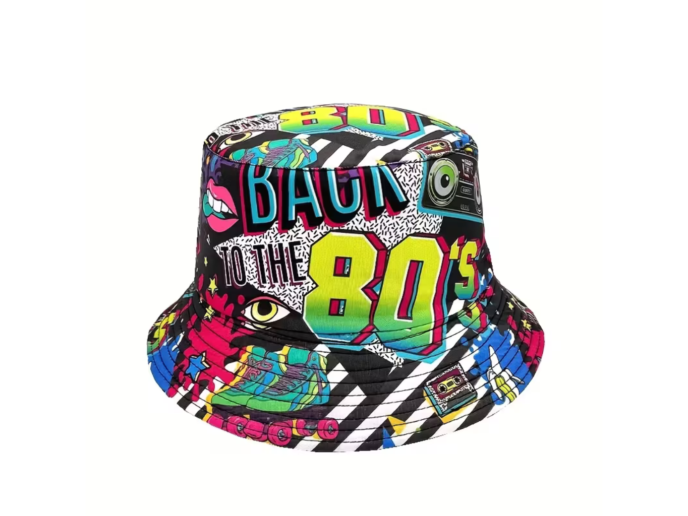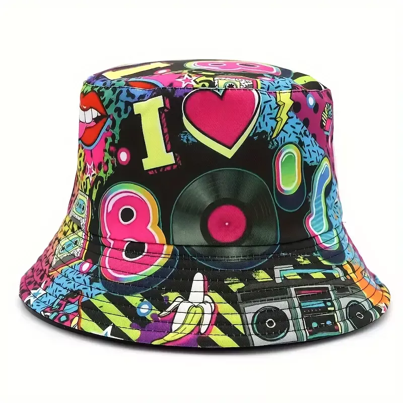 Přeneste se zpět do zlaté éry osmdesátek s tímto stylovým černým kloboukem, který je zdobený typickými neonovými motivy jako gramodesky, kazeťák, čísla a další symboly této nezapomenutelné dekády.