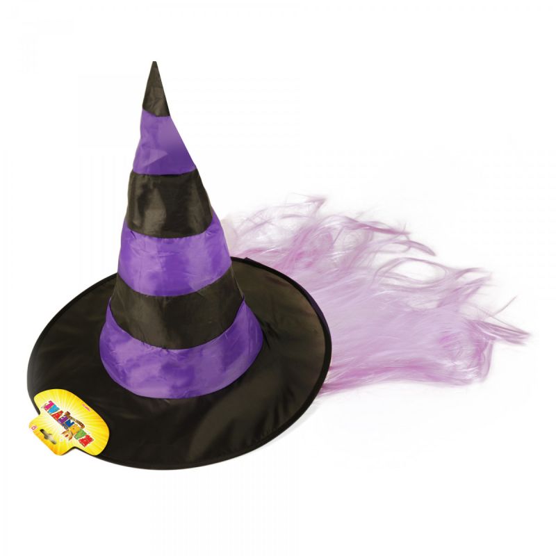 Čarodějnický klobouk černo-fialové barvy je dekorován světle fialkovými vlasy. Perfektní doplněk na Halloween párty nebo karneval!