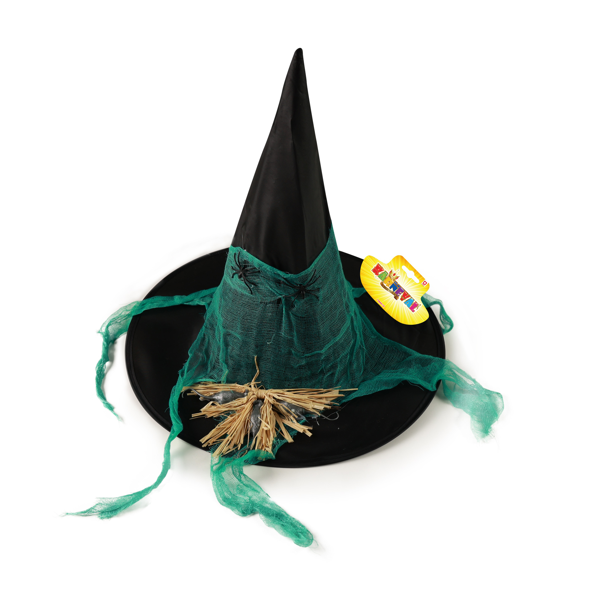 Stylový čarodějnický klobouk pro dospělé. Tento parádní kousek černé barvy je zdoben zelenou gázou a pavoučky. Staňte se hvězdou karnevalového večírku díky tomuto nepřehlédnutelnému klobouku a ohromte tak všechny své přátele!