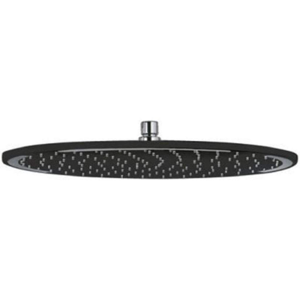 Hlavová sprcha, 1jet povrchová úprava černý mat a chrom provedení celokovové talířová hlavová sprcha DN 15 průměr 300 mm průtok 23 l/min při tlaku 3 bary Rychlé čištění vápenatých usazenin na silikonových tryskách kulový kloub pro natáčení přípojka G 1/2 bez sprchového ramena