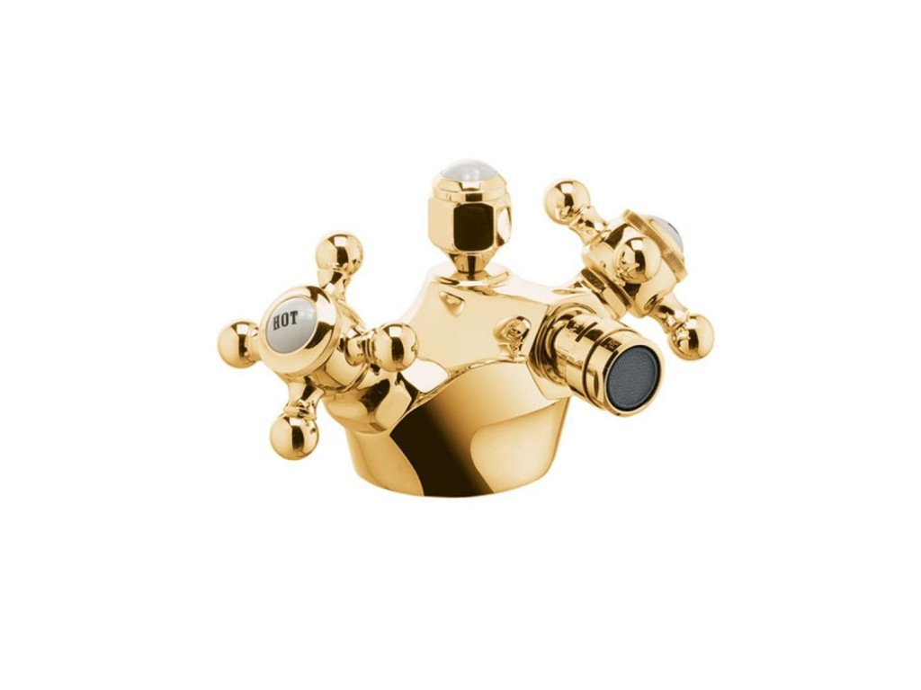 Stojánková bidetová baterie 1926 bidetová baterie DN 15 rustikální rukojetě jednootvorová montáž třída průtoku A kulový kloub - kaskádový perlátor M 24x1 keramický vršek 180° s výpustí G 1 1/4 měděné trubky 10 mm povrchová úprava pozlacená 23k