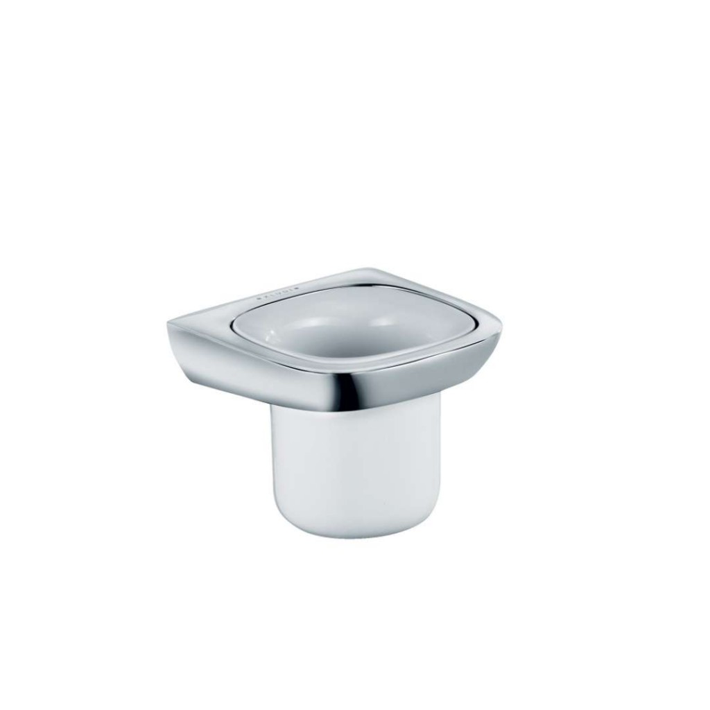 Pohárek na kartáčky a pastu s držákem provedení pohárku bílý porcelán provedení držáku chrom nástěnná montáž včetně upevňovacího materiálu
