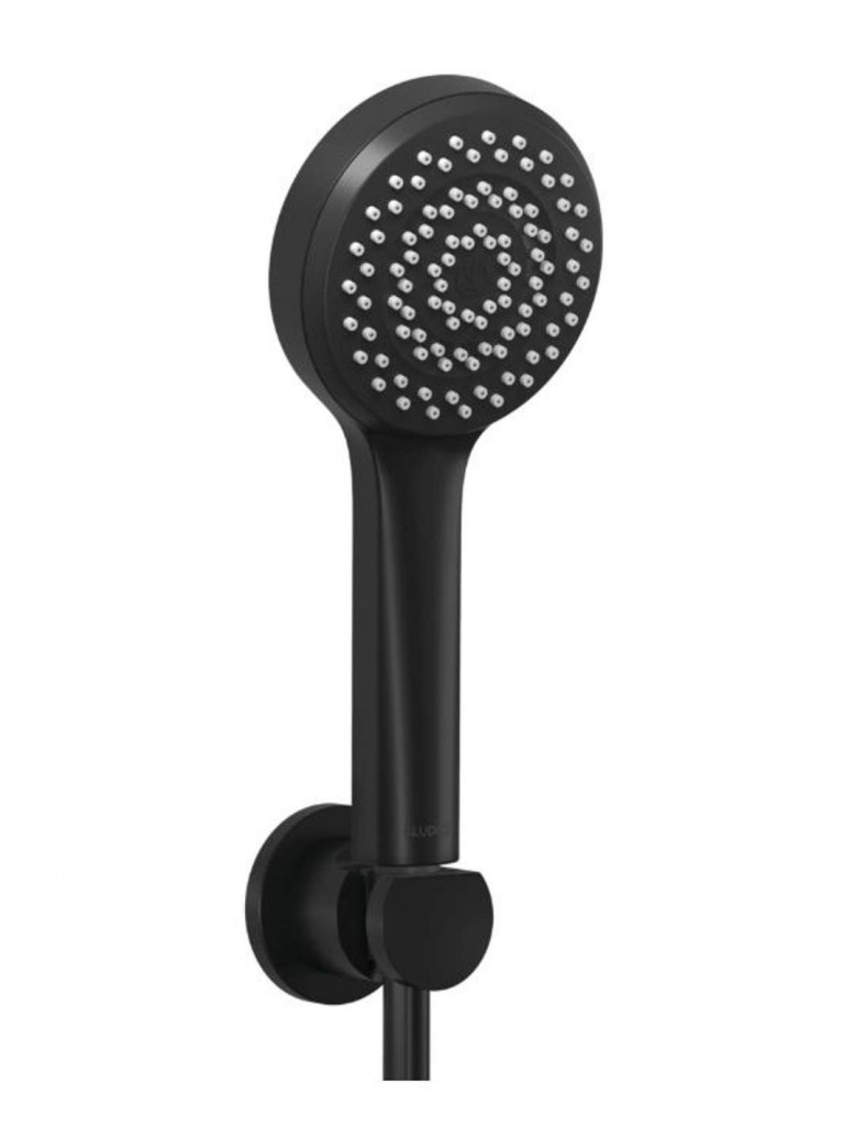 Set ruční sprchy Obsahuje: sprchovou hlavici Dive S 1S barva: matná černá průměr hlavice: 107 mm rozměr: 240 x 107 x 30 mm trysky ze silikonu pro snadné a rychlé čištění usazenin 1 proud: Body - široký relaxační sprchový proud průtok: 15 l/min (při tlaku 3 bary) sítko na zachycení nečistot připojení G 1/2" sprchovou hadici připojení: 2x G 1/2 délka: 1250 mm pokrytá plastovým povrchem držák s kónickými maticemi nástěnný průměr kruhové krycí rozety: 52 mm Ilustrační foto