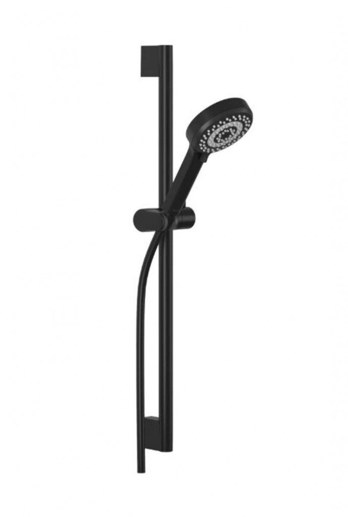 Sprchová souprava DIVE S 1S Obsahuje: ruční sprchu DIVE S 1S barva: matná černá průměr hlavice: 107 mm 1 proud: Body - široký relaxační sprchový proud snadné a rychlé čištění vápenatých usazenin průtok: 15 l/min (při tlaku 3 bar) sprchovou tyč s držákem sprchy rozteč uchycení sprchové tyče: 620 mm funkční délka: 600 mm sprchovou hadici s Anti Twist systémem proti překroucení délka: 1600 mm připojení: 2x G 1/2