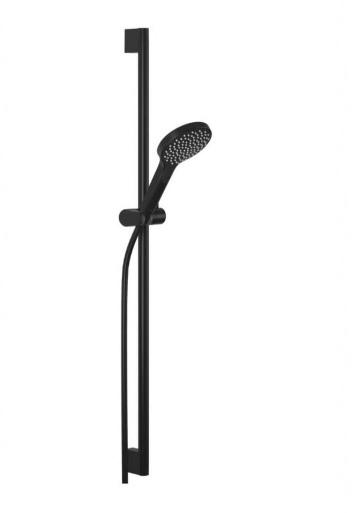 Sprchová souprava Obsahuje: ruční sprchu Dive X 1S barva: matná černá průměr hlavice: 117 mm 1 proud: Body: široký relaxační sprchový proud snadné a rychlé čištění vápenatých usazenin průtok: 15 l/min (při tlaku 3 bar) sítko na zachycení nečistot sprchovou hadici barva: matná černá s Anti Twist systémem proti kroucení délka: 1600 mm připojení: 2x G1/2 sprchovou tyč s držákem barva: matná černá rozteč uchycení: 915 mm nastavitelný držák na tyč Ilustrační foto