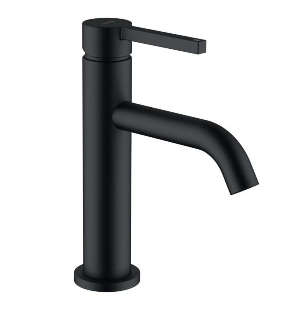 Páková umyvadlová baterie barva: matná černá materiál: mosaz výška: 195 mm délka výtoku: 130 mm komfortní zóna: 100 mm stojánková montáž pákové ovládání perlátor Cache S-pointer, M 18×1 průtok: 4,5 l/min při tlaku 3 bar keramická kartuše připojení DN 15 / G 3/8'' bez výpusti Ilustrační foto