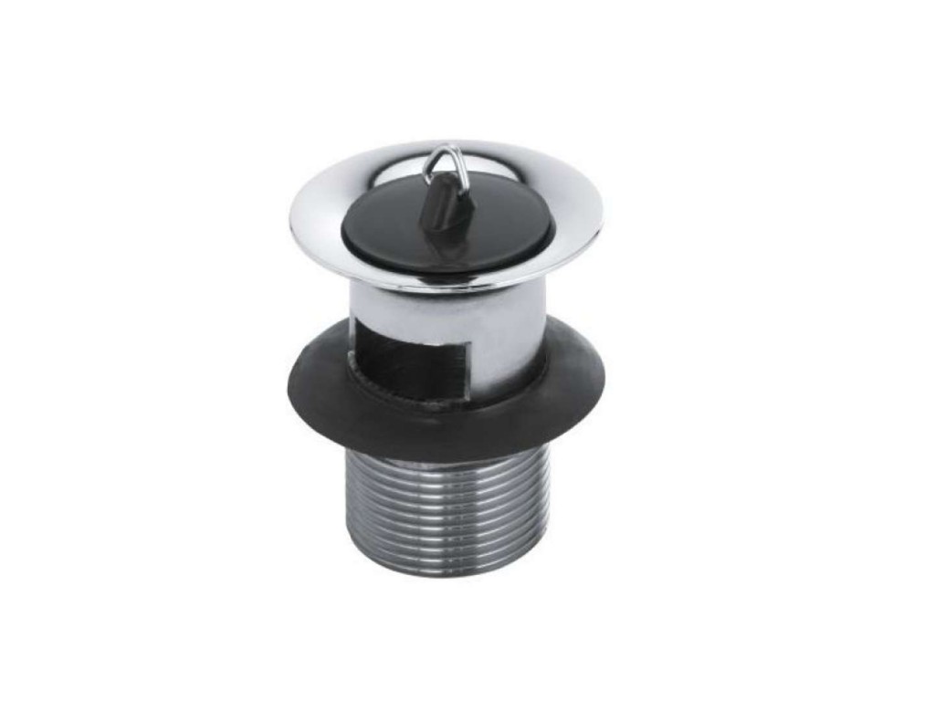 Vypouštěcí ventil, s přepadem určeno pro dřezy a bidety barva chrom materiál mosaz a plast ventil G 1 1/4 průměr 63 mm výška 90 mm hloubka max 50 mm bez řetězu s držákem