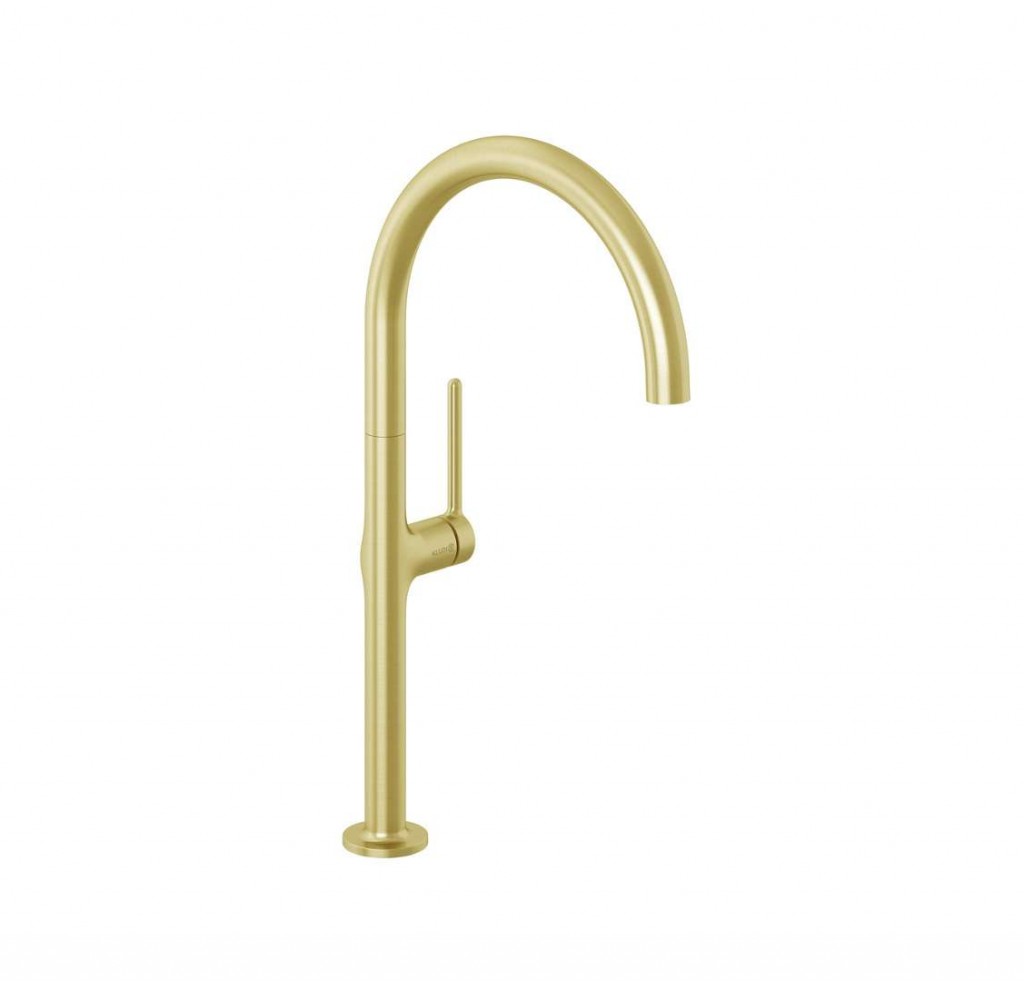 Páková kuchyňská baterie materiál kartáčované zlato délka výtoku 215 mm výška 425 mm komfortní zóna 295 mm stojánková montáž pákové boční ovládání otočné rameno (360°) keramická kartuše perlátor M 16,5 x 1 připojení G 3/8''