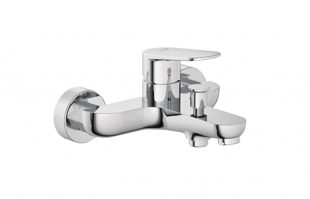 Nástěnná vanová baterie barva chrom šířka 190 mm délka výtoku 170 mm pákové ovládání nástěnná montáž rozteč 150 ± 14 mm kruhové krycí rozety průměr 60 mm automatický přepínač perlátor M 24 keramická kartuše s omezením horké vody zabezpečení proti zpětnému toku připojení G 1/2"