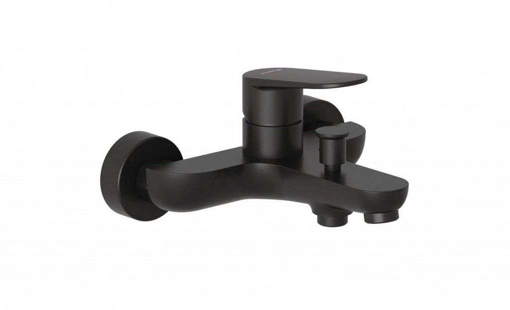 Nástěnná vanová baterie barva matná černá šířka 190 mm délka výtoku 170 mm pákové ovládání nástěnná montáž rozteč 150 ± 14 mm kruhové krycí rozety průměr 60 mm automatický přepínač perlátor M 24 keramická kartuše s omezením horké vody zabezpečení proti zpětnému toku připojení G 1/2"