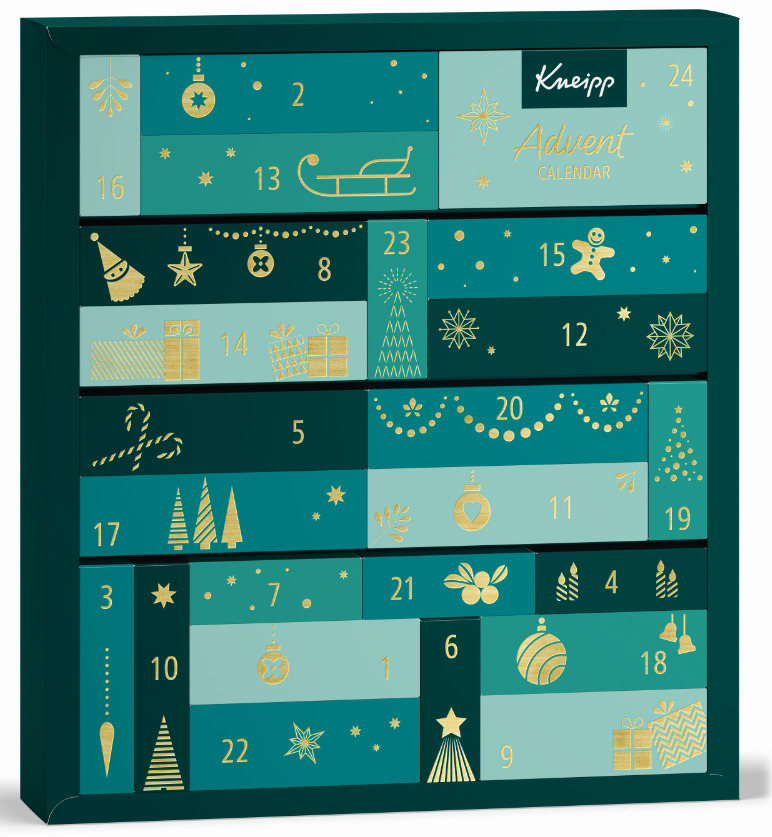 Kdo říká, že adventní kalendáře jsou jen pro děti? Kneipp Adventní kalendář je pro všechny, kdo si chtějí ve svátečním čase zarelaxovat a pečovat o své tělo i mysl. Pod okénky se celkem skrývá 24 oblíbených kosmetických produktů značky Kneipp včetně novinek. To vše v nádherném dárkovém balení z certifikovaného FSC® papíru z udržitelných zdrojů včetně papírového stojanu.