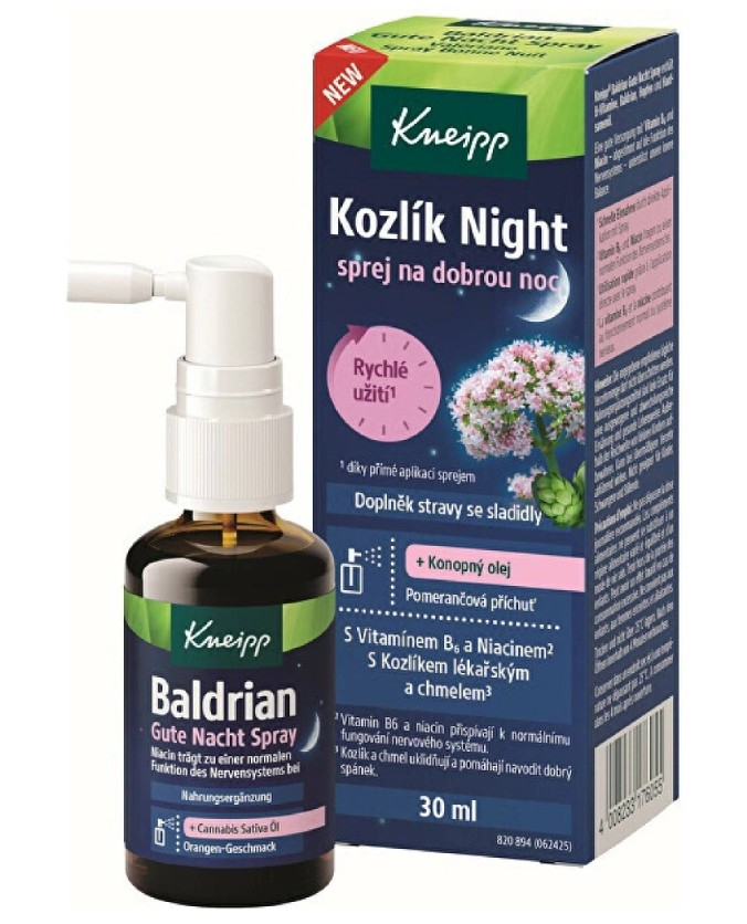 Kneipp ústní sprej Kozlík Night pomáhá k lepšímu usínání i spánku díky vitamínům skupiny B, kozlíku lékařskému, chmelu a konopnému oleji. Sprej doplní vaši zásobu vitamínu B6 a niacinu, které pomáhají ke správné funkci nervového systému a podporují vnitřní rovnováhu. Forma spreje urychluje vstřebávání a hodí se pro použití těsně před spaním. Vyzkoušejte skvělou alternativu k melatoninu, která vám podpoří cestu do říše snů.