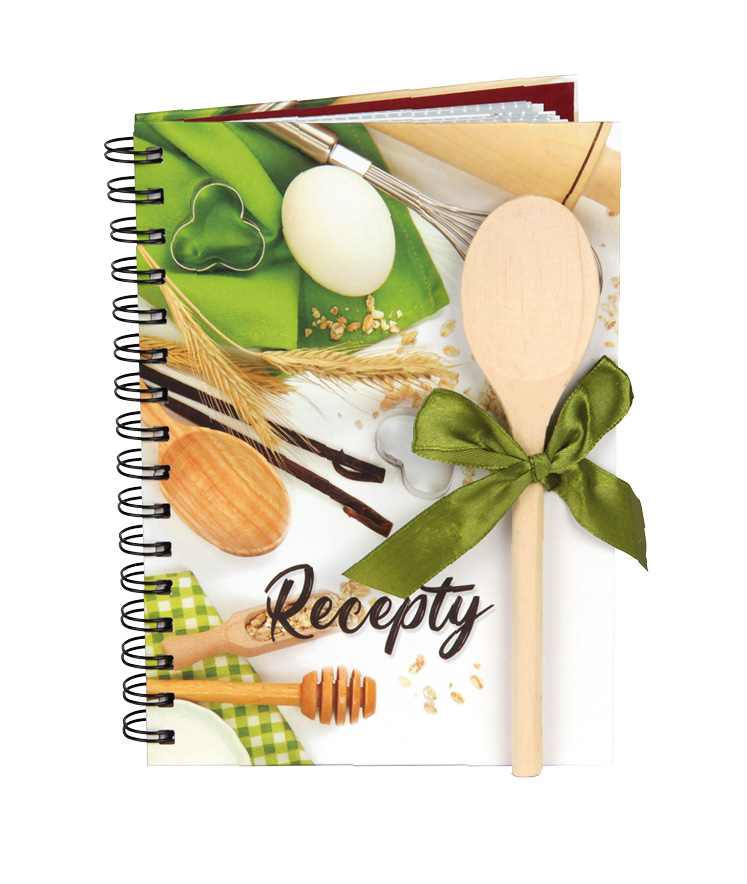 Nové knihy na recepty s vařečkou obsahují úplně nové zpracování vnitřních listů. Stránky jsou linkované bez popisků. Každých 8 listů je rozděleno papírovým rozdělovníkem, který je možno si popsat druhem receptu. Kniha obsahuje celkem 10 rozdělovníků. Kniha s boční dvojitou spirálou a velmi kvalitním pevnými deskami je perfektní jako dárek pro vášnivé kuchaře a kuchařky, které si chtějí uchovat svoje nejlepší recepty. Na úvodních deskách je mašlí připevněna vařečka, kterou lze používat při vaření, místo ní si pak můžete připevnit např. tužku na psaní receptů. Materiál: papír, dřevěná vařečka. Rozměry: 14,5x1,2 x20,5 cm.