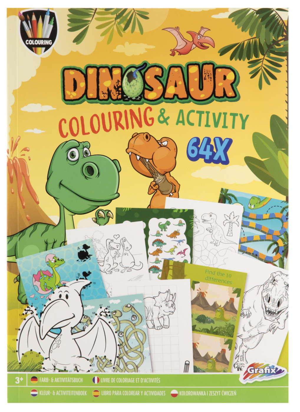 Kniha obsahuje 64 stran různých aktivit -vymalovávání, lepení, samolepky, bludiště, malování podle čísel, hádanky s motivem Dino.
