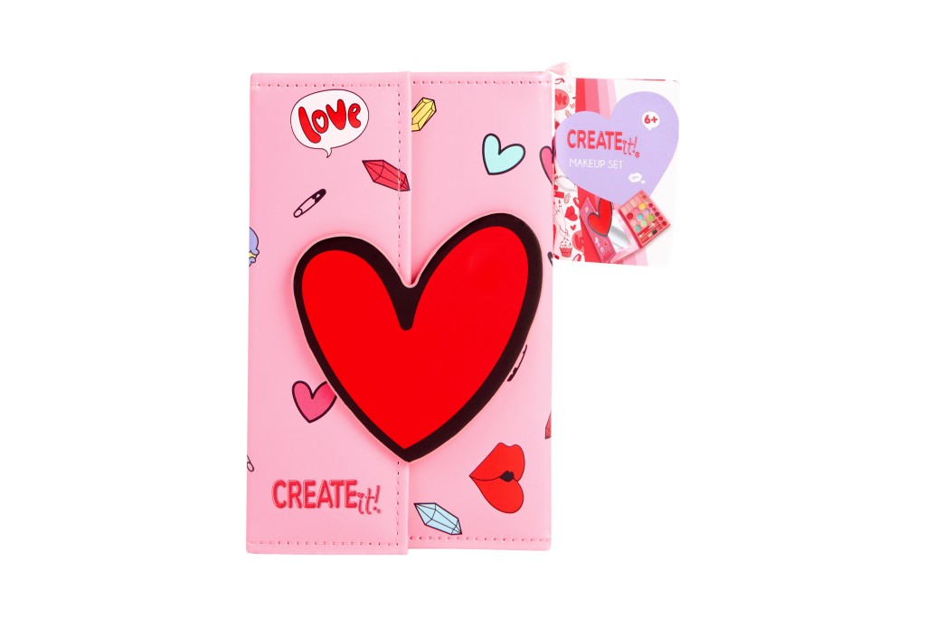 Kniha s líčením na magnet – hniha po rozevření obsahuje aplikátor na oční stíny, štetec, šteček, 4× make up, 9 barev očních stínů a 8 barev rtěnek + zrcátko.