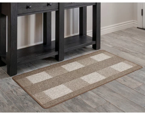 Stylový běhoun v béžové barvě o rozměrech 67x120 cm se skvěle hodí do jakéhokoli interiéru, zejména do kuchyně či předsíně. Čtvercový vzor přidá vašemu domovu moderní šmrnc.