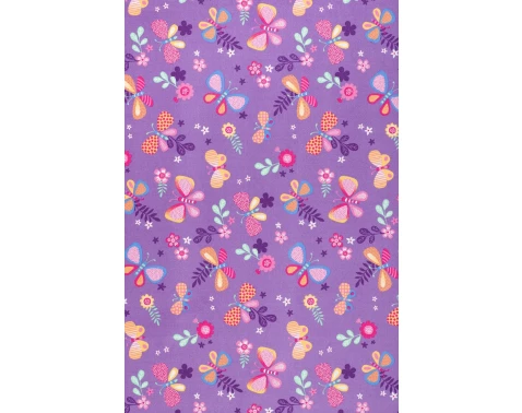 Fialový koberec se vzorem barevných motýlů a kytek se hodí do dětského pokoje. Veselý design dodá místnosti hravou a útulnou atmosféru. Rozměr 100x150 cm.