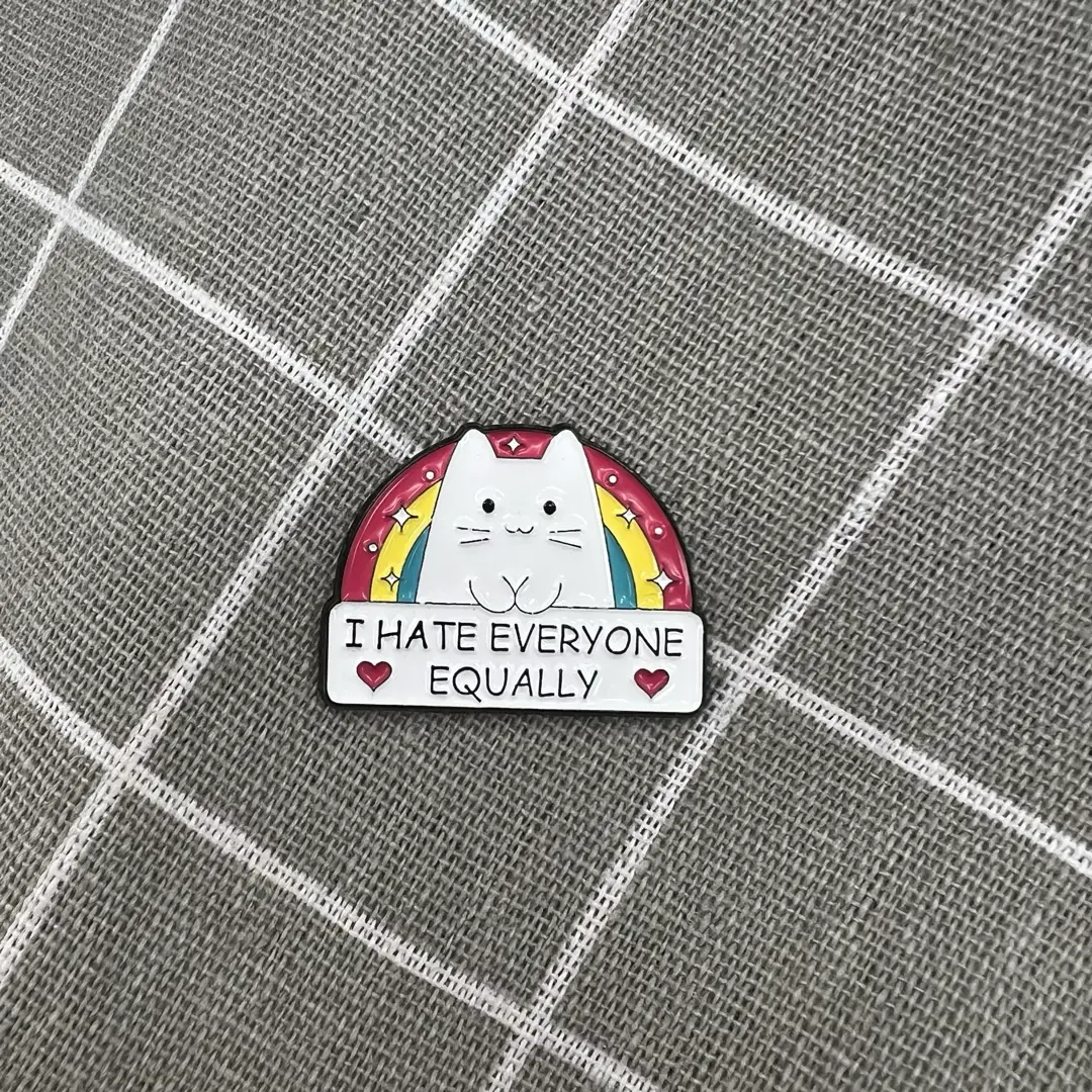 Kočička s duhou – „I hate everyone equally“ / „Nenávidím všechny stejně“\nRoztomilý, ale zároveň sarkastický smaltovaný odznáček s motivem bílé kočičky, duhy a nápisem „I hate everyone equally“. Ideální kombinace cuteness a ironie pro všechny, kdo milují kočky a humor s nadhledem.\n📌 Kvalitní smaltovaný odznáček s barevným designem\n🐱 Kočička, duha a ironický text v jednom\n🎒 Skvělý doplněk na batoh, tašku, mikinu nebo klopu saka\n🎁 Originální dárek pro kamarády se smyslem pro humor a sarkasmus\nTento odznáček je dokonalým vyjádřením toho, že láska k ironii může být stejně silná jako láska ke kočkám.