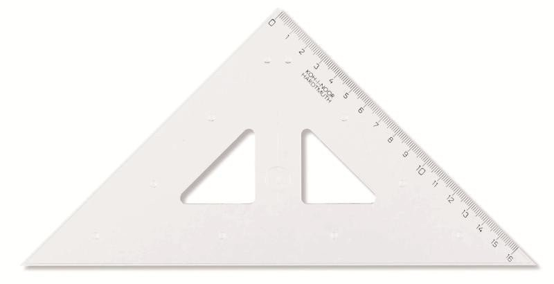 Trojúhelník 45/177 s kolmicí a prolisky vyrobený z čirého průhledného polystyrenu. Stupnice je naražena technologií horké ražby. Přesnost stupnice 0,2% délky. Mimo délkové stupnice je vybaven i ryskou pro konstruování kolmic. Na spodní straně je opatřen prolisky Trojúhelník je určený k technickému kreslení ve škole i v kanceláři. Výhodou jsou prolisky pro pohodlnější práci s tuší a snadnější posouvání po papíře. Zabalen je do polyetylenového sáčku s eurozávěsem.